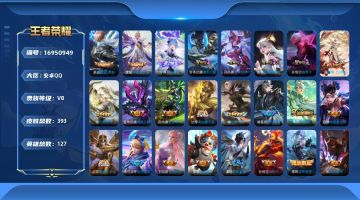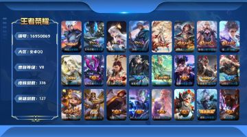 贵族等级:v8皮肤数:336传说品质22 情人节限定3 生肖限定8 荣耀典藏1 英雄数:127
