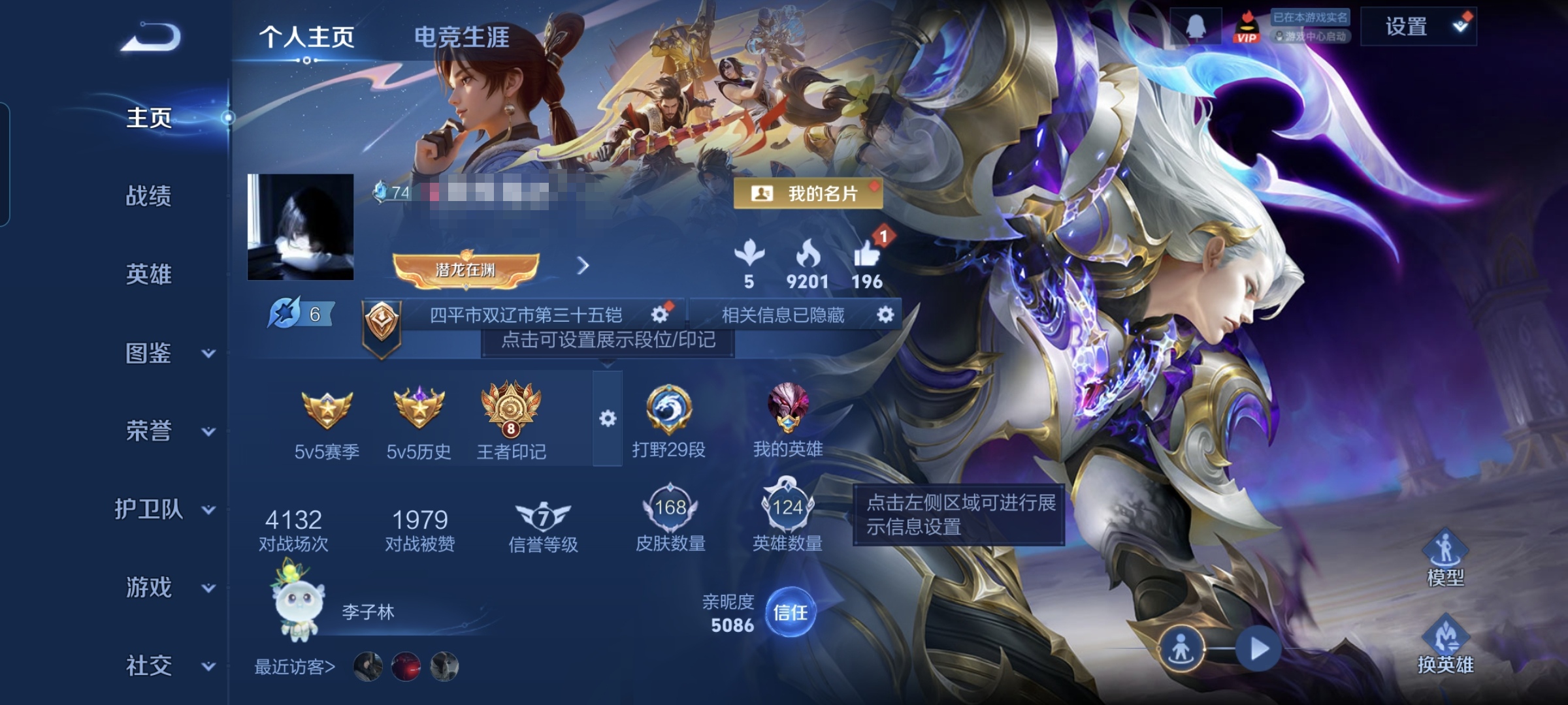 贵族等级:v6皮肤数:168传说品质8 生肖限定2 荣耀典藏1 英雄数:124