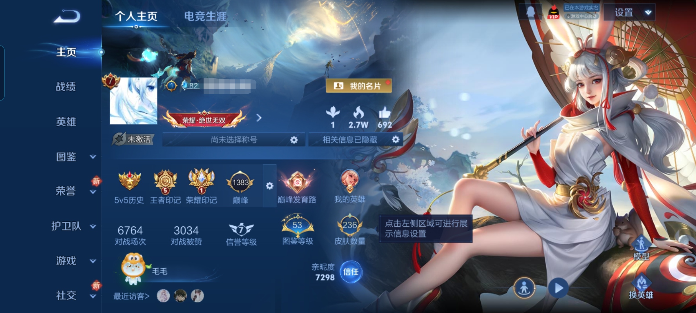 贵族等级:v8皮肤数:341情人节限定3 传说品质19 生肖限定7 荣耀典藏2 英雄数:126