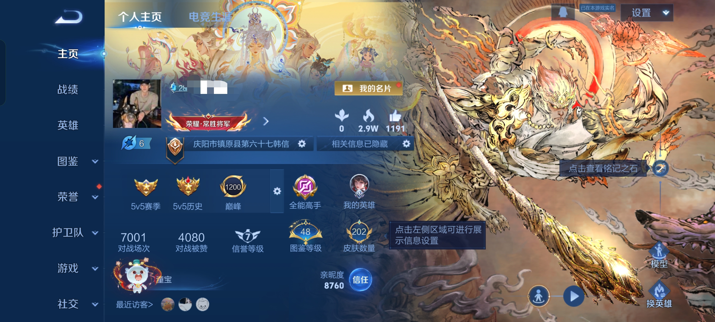 贵族等级:v7皮肤数:207传说品质11 生肖限定5 情人节限定1 无双1 荣耀典藏2 英雄数:127