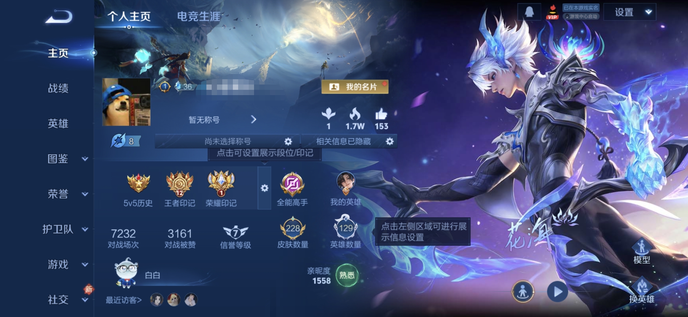 贵族等级:v7皮肤数:255传说品质3 生肖限定1 荣耀典藏1 英雄数:127
