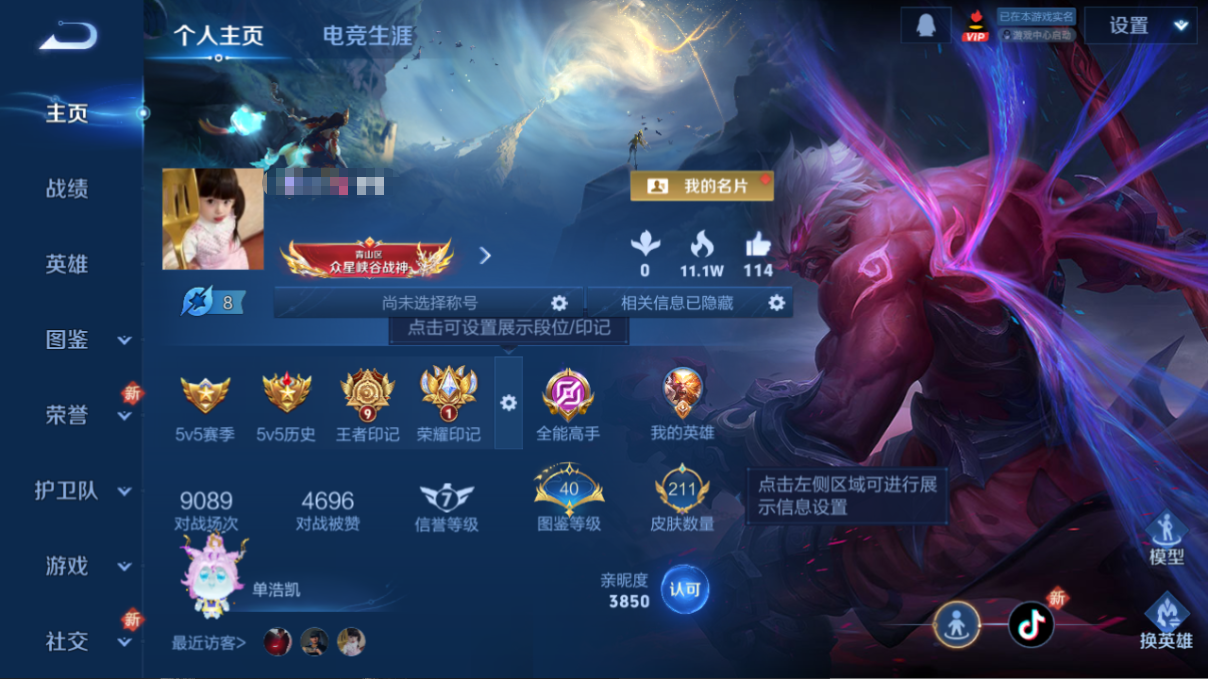 贵族等级:v6皮肤数:167荣耀典藏1 传说品质1 英雄数:123