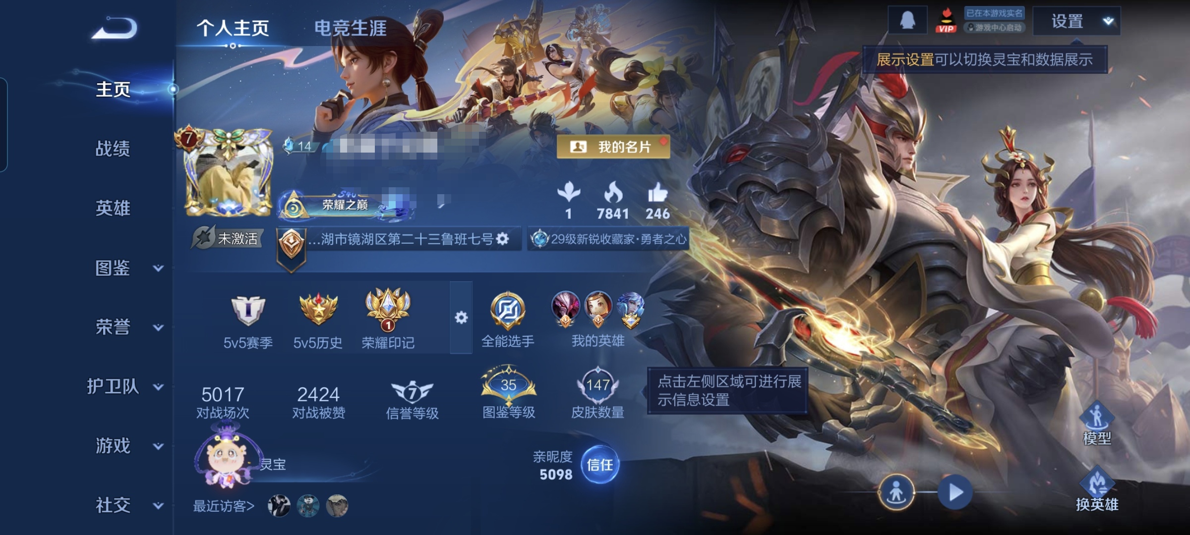 贵族等级:v7皮肤数:244传说品质7 生肖限定3 珍品传说1 荣耀典藏1 英雄数:125