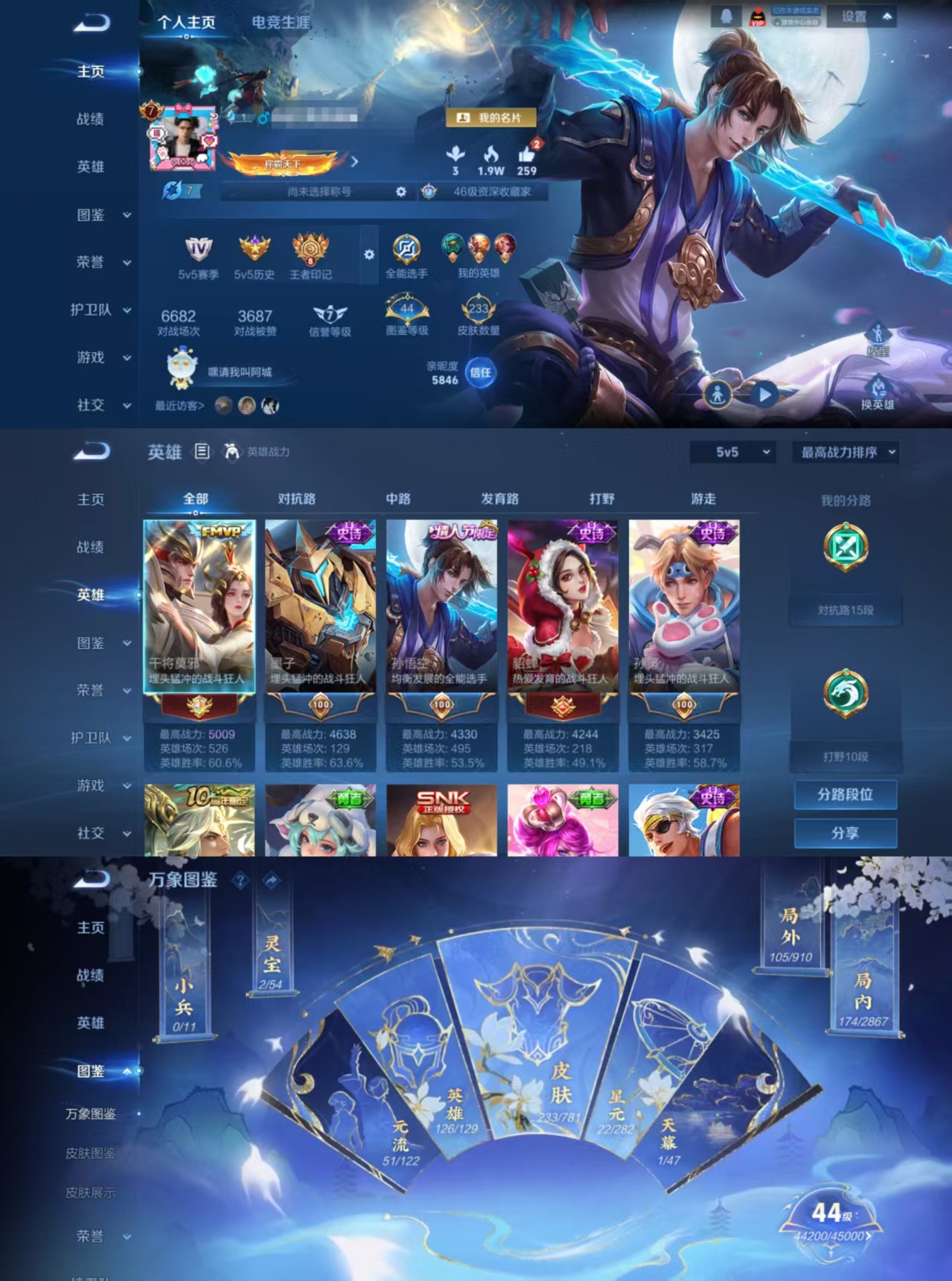 贵族等级:v9皮肤数:361传说品质27 生肖限定11 情人节限定4 荣耀典藏1 英雄数:128