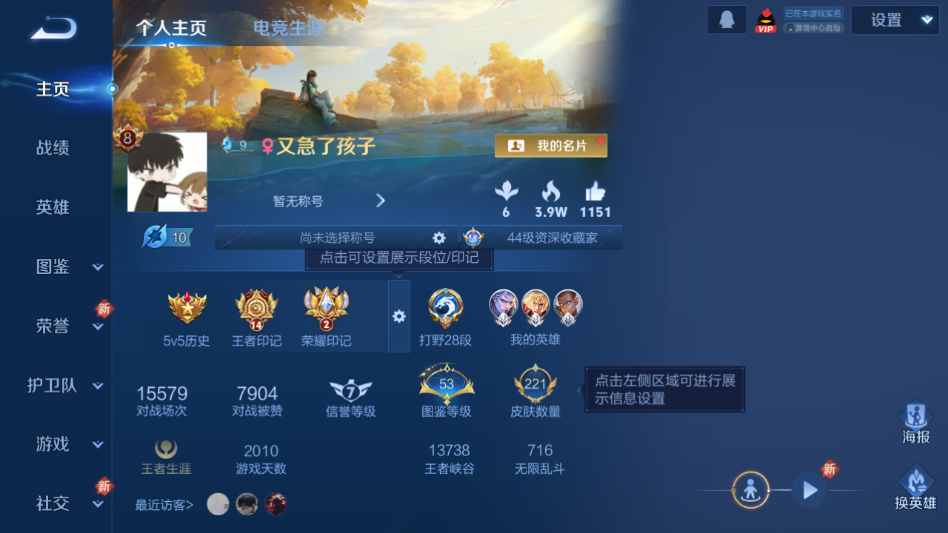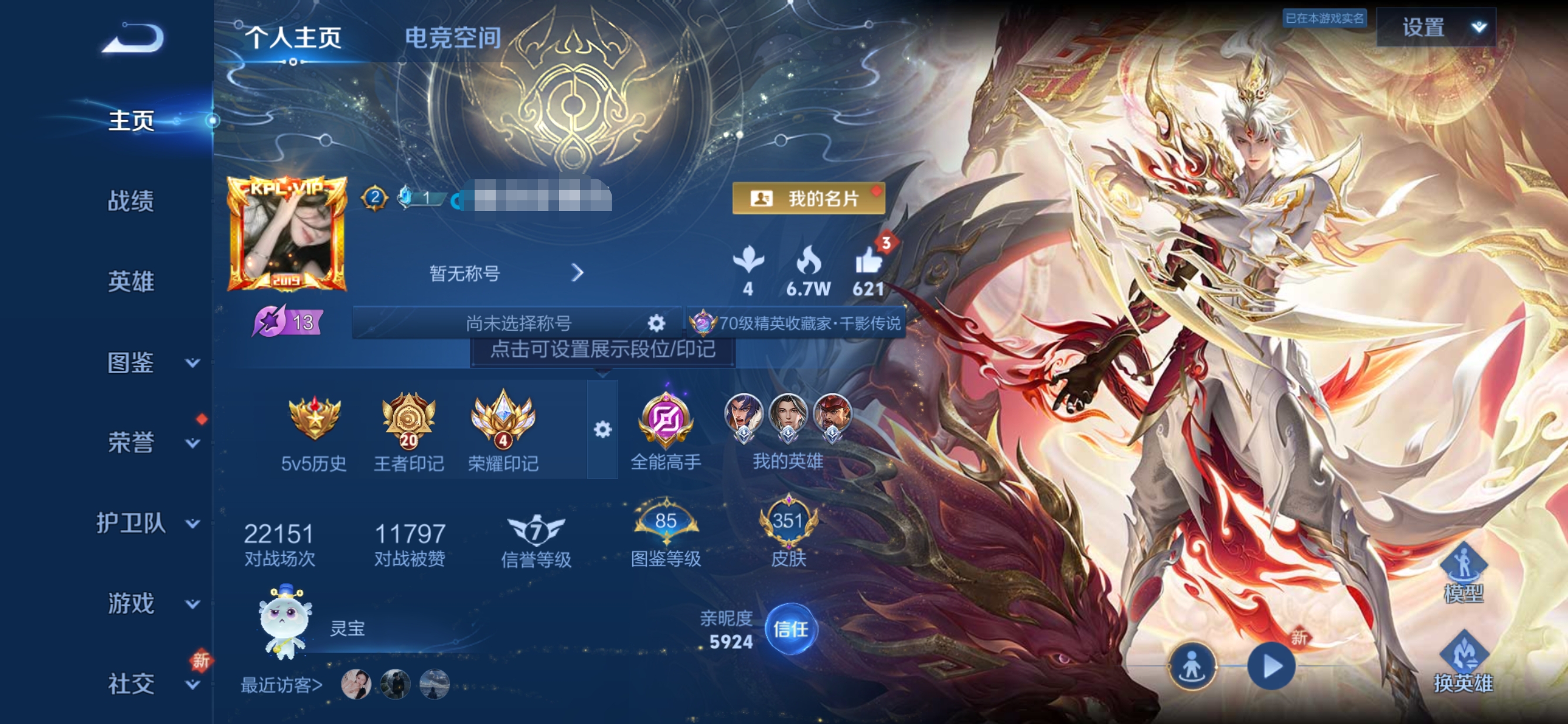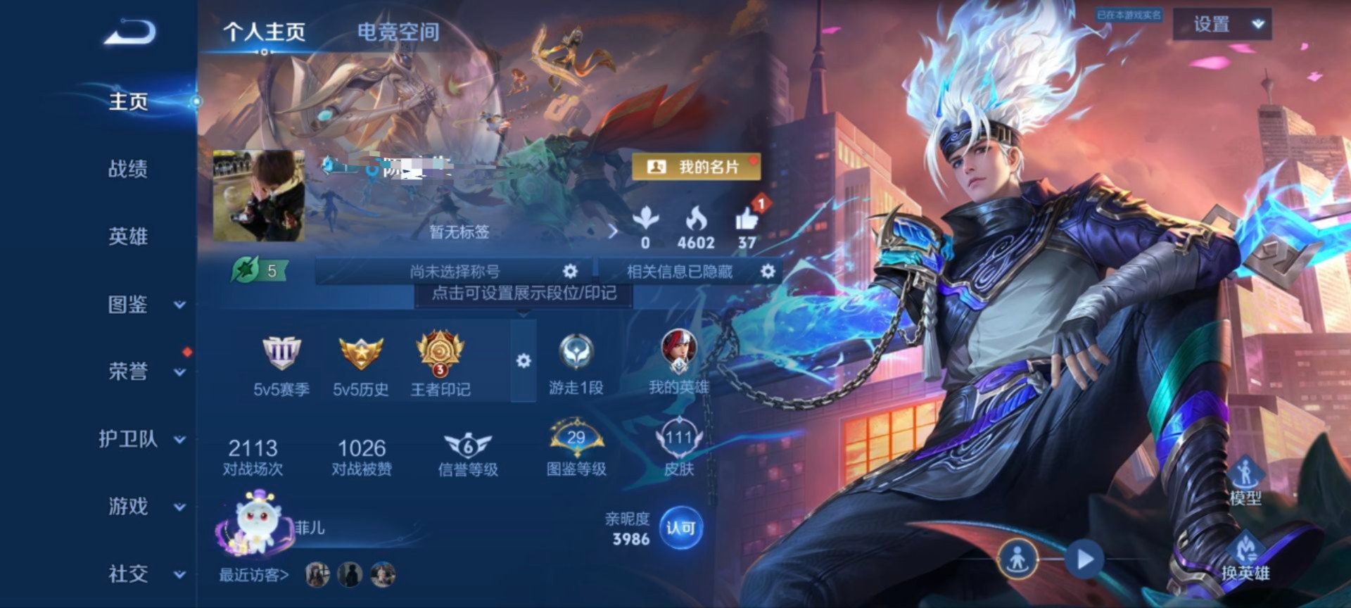 贵族等级:v6皮肤数:111传说品质2 生肖限定1 荣耀典藏1 英雄数:107