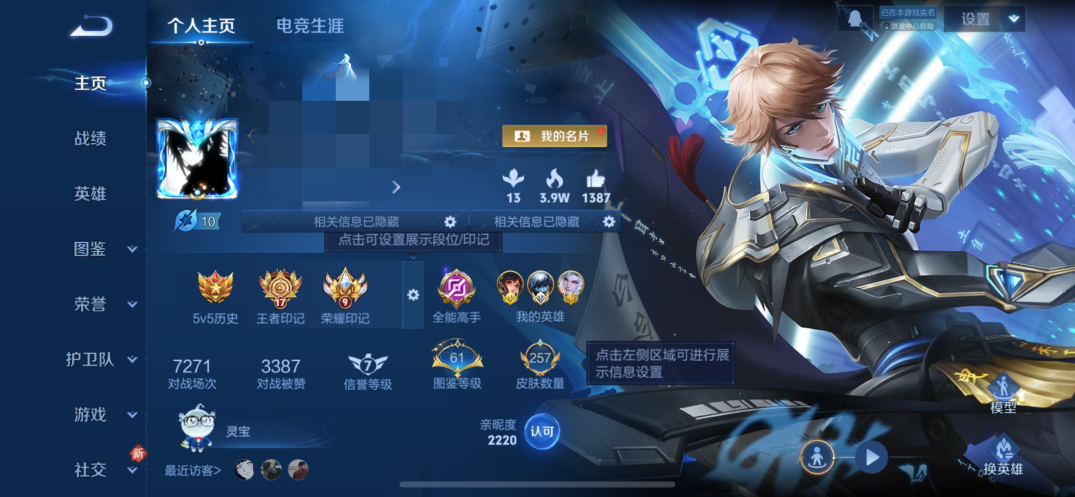 贵族等级:v7皮肤数:257传说品质13 生肖限定5 荣耀典藏1 英雄数:124