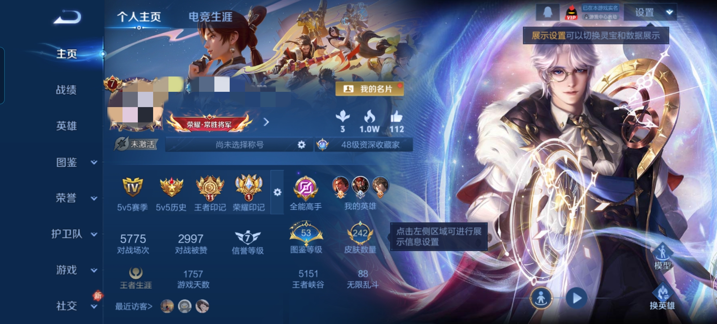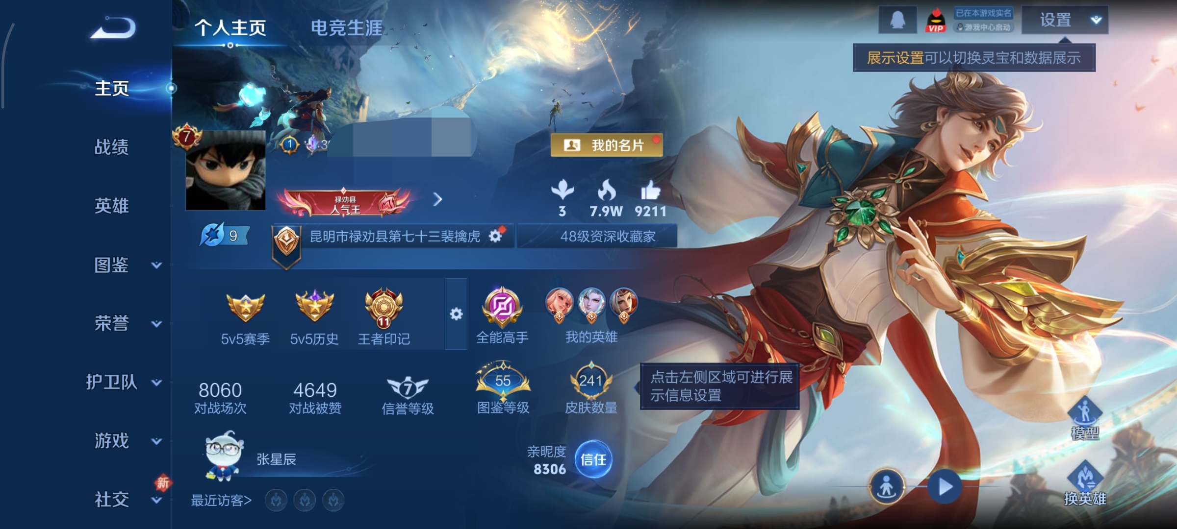 贵族等级:v7皮肤数:242传说品质8 生肖限定3 荣耀典藏1 情人节限定1 英雄数:126