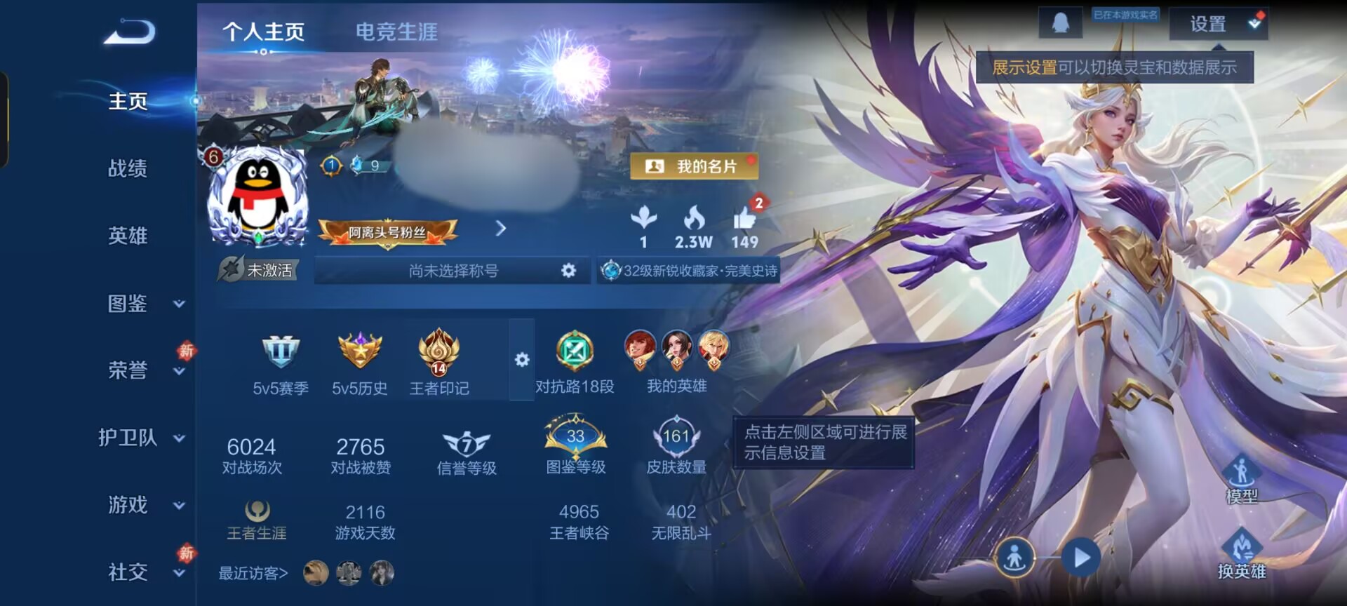 贵族等级:v6皮肤数:161传说品质5 生肖限定4 荣耀典藏1 英雄数:127