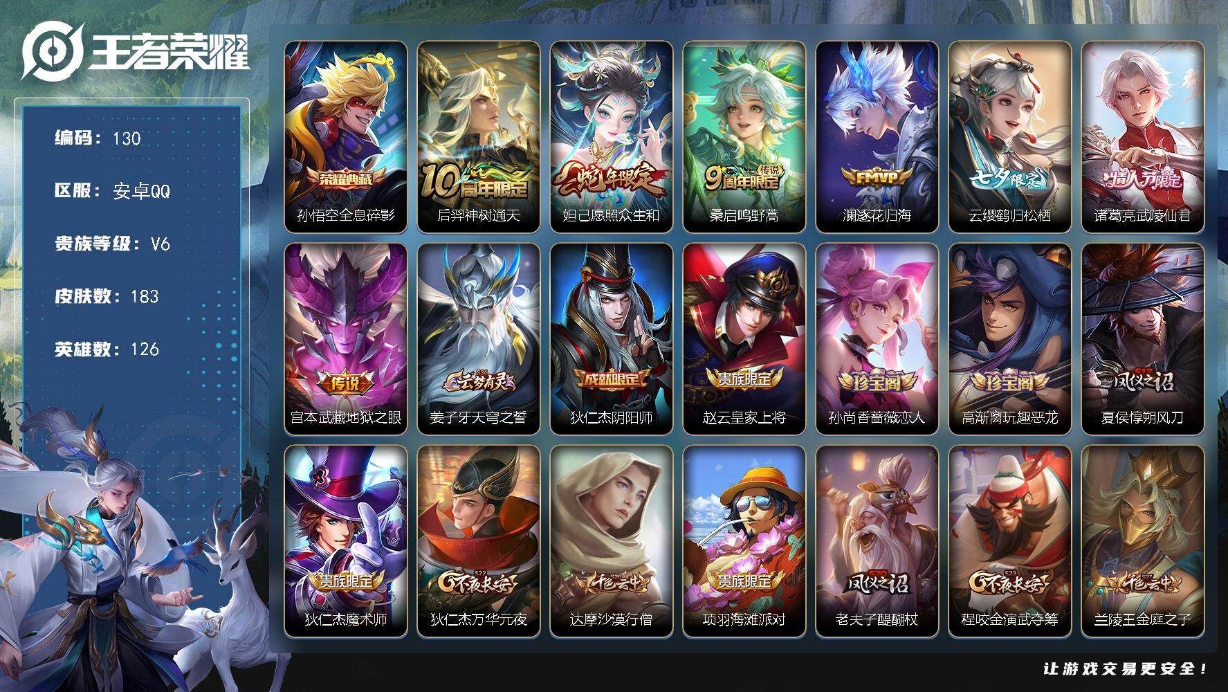 贵族等级:v5皮肤数:130传说品质7 生肖限定1 荣耀典藏1 英雄数:113