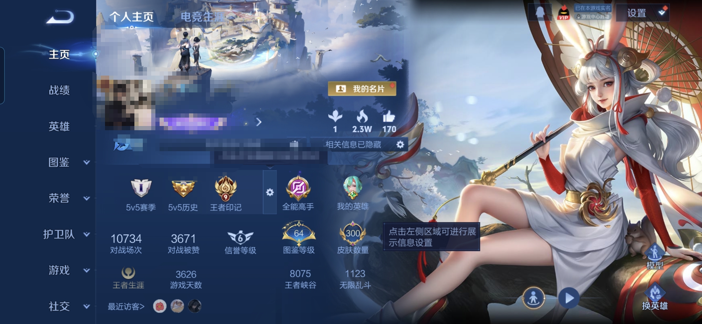 贵族等级:v7皮肤数:262传说品质10 生肖限定1 荣耀典藏1 情人节限定1 英雄数:126