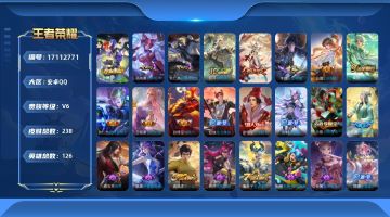 贵族等级:v6皮肤数:238传说品质8 生肖限定1 情人节限定1 珍品传说1 英雄数:126