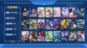 贵族等级:v8皮肤数:336传说品质17 情人节限定2 无双2 生肖限定2 荣耀典藏2 珍品传说3 英雄数:127