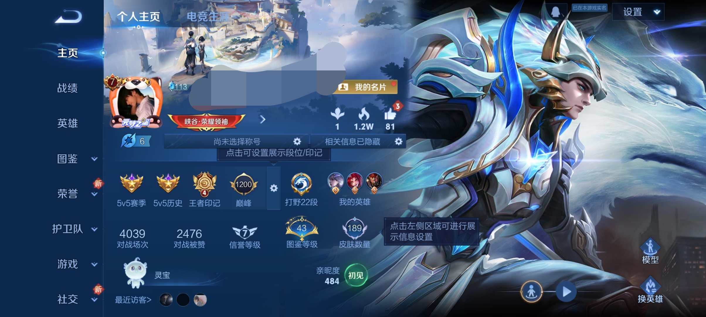 贵族等级:v8皮肤数:291传说品质14 生肖限定4 情人节限定4 荣耀典藏2 英雄数:126