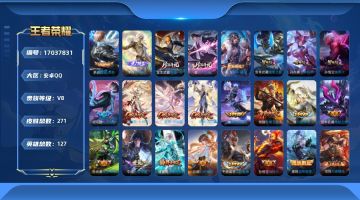 贵族等级:v9皮肤数:356生肖限定9 情人节限定5 传说品质36 荣耀典藏2 无双1 英雄数:129