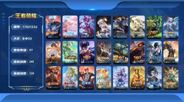 贵族等级:v7皮肤数:245传说品质11 生肖限定1 情人节限定1 珍品传说1 荣耀典藏1 英雄数:126