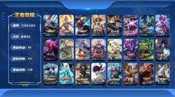 贵族等级:v9皮肤数:357传说品质21 生肖限定5 情人节限定1 荣耀典藏3 无双1 珍品传说2 英雄数:128