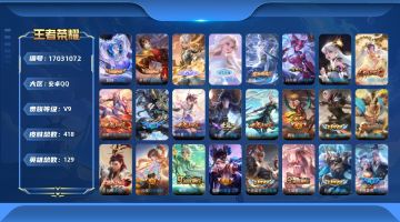 贵族等级:v9皮肤数:418生肖限定12 传说品质23 情人节限定1 荣耀典藏2 珍品传说1 无双2 英雄数:129