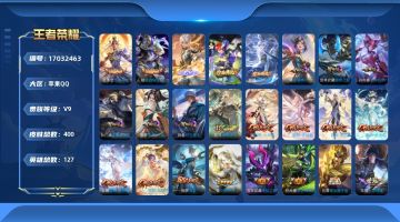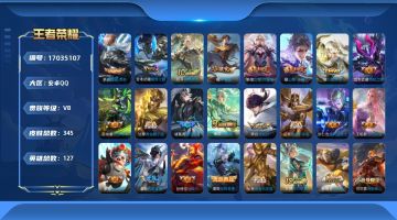 贵族等级:v8皮肤数:345传说品质19 情人节限定1 生肖限定4 荣耀典藏1 英雄数:127