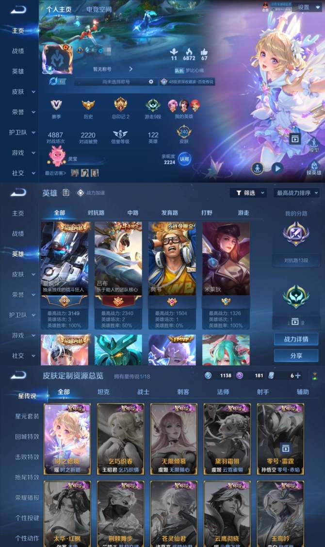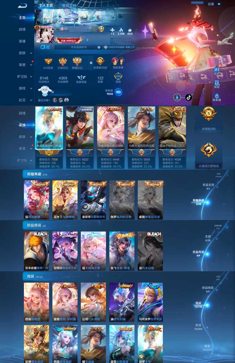 贵族等级:v8皮肤数:290珍品传说4 传说品质13 荣耀典藏3 情人节限定1 生肖限定3 英雄数:122