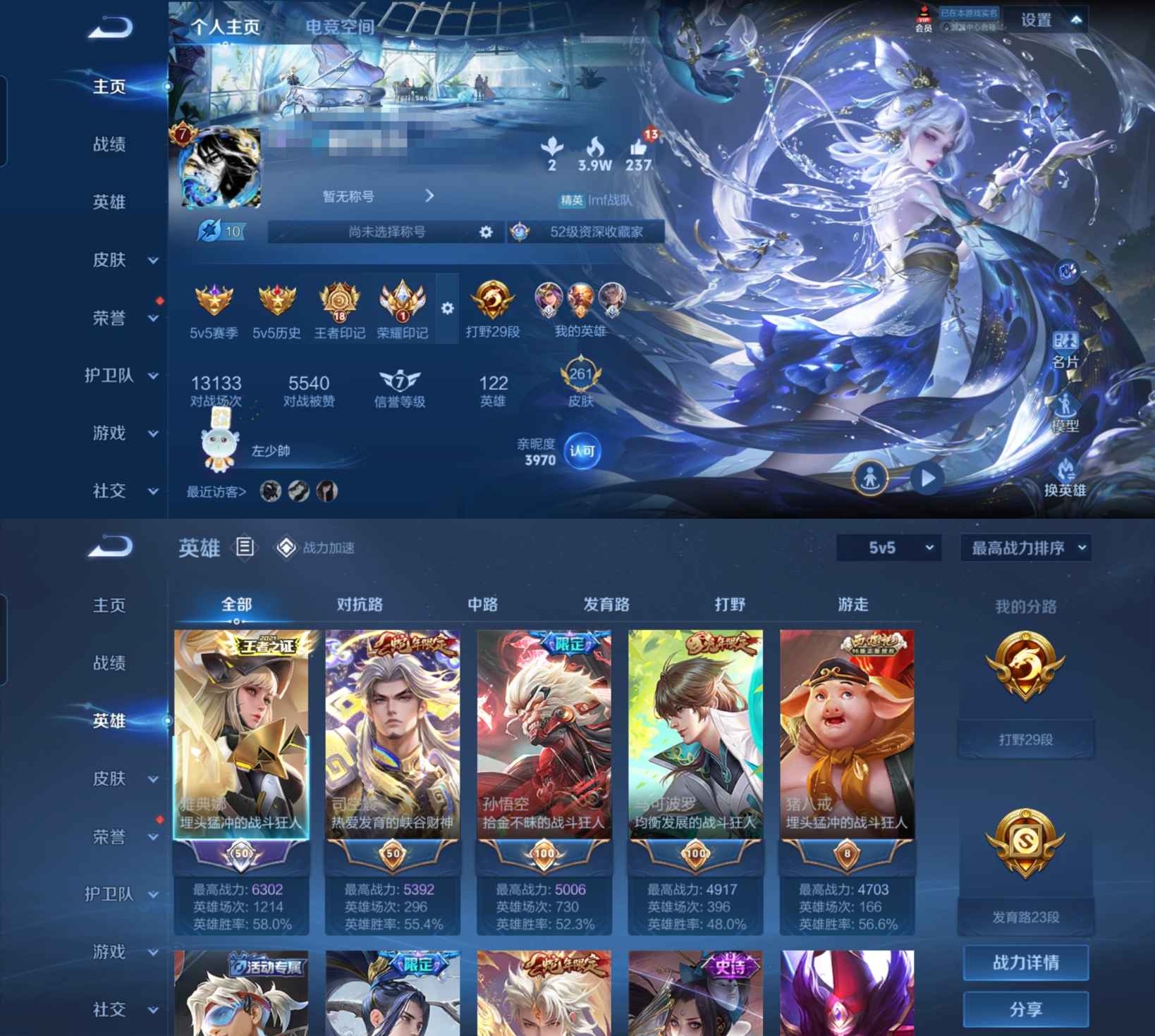 贵族等级:v6皮肤数:209传说品质16 生肖限定4 英雄数:126