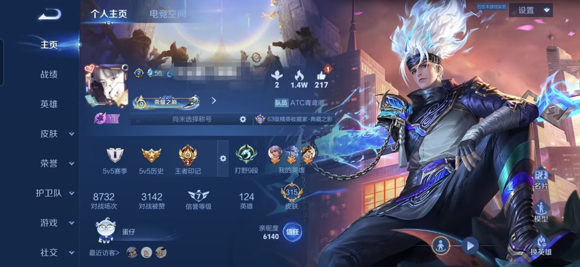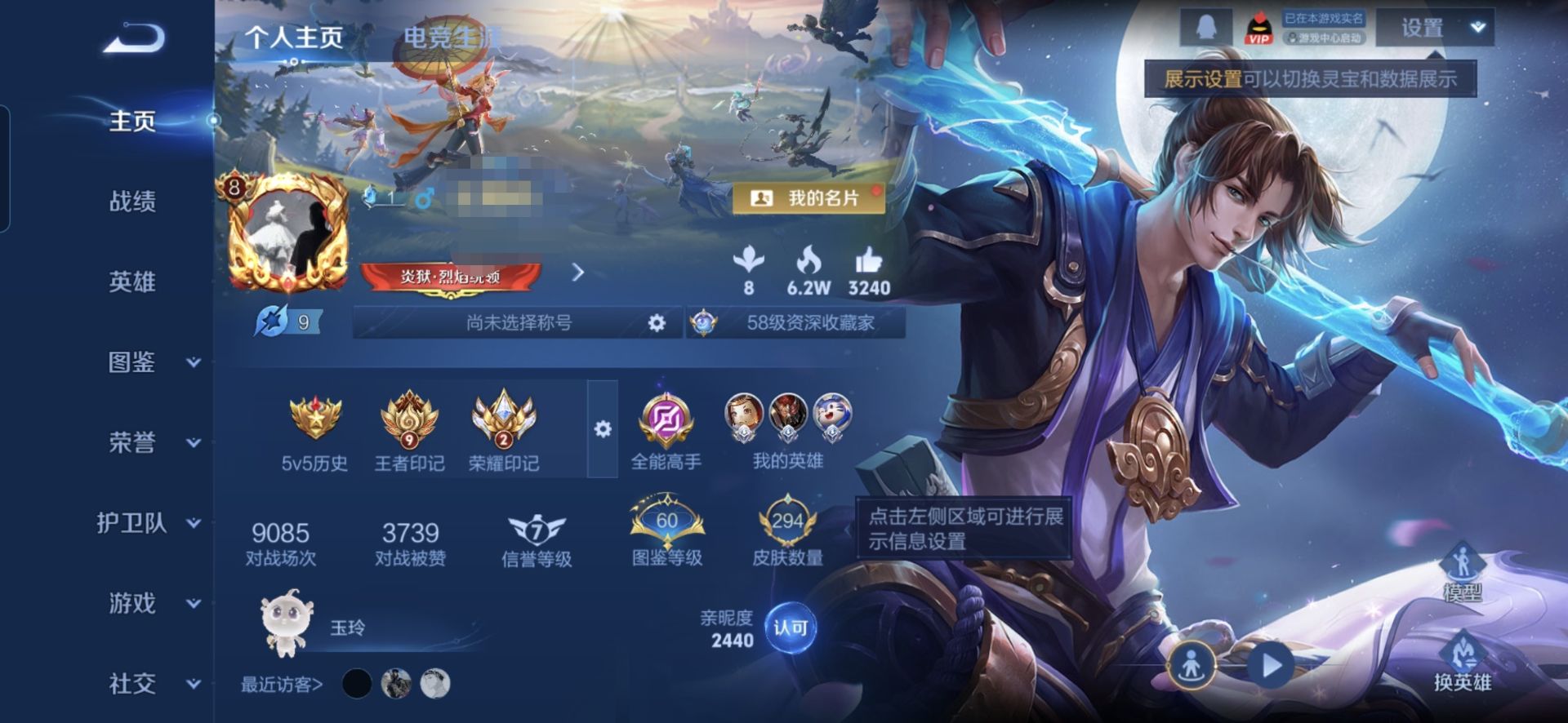 贵族等级:v7皮肤数:315传说品质6 荣耀典藏1 英雄数:124