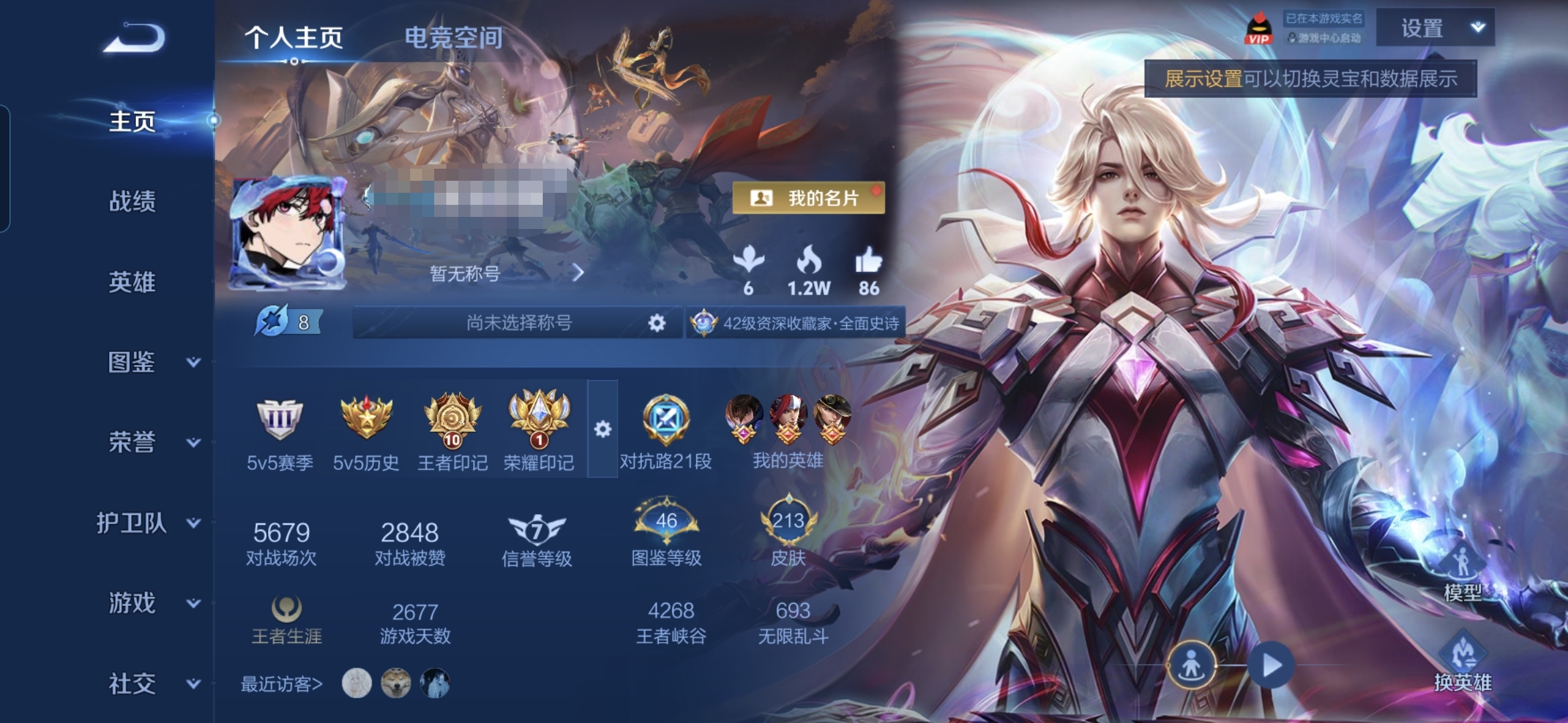 贵族等级:v8皮肤数:424传说品质39 情人节限定10 生肖限定17 荣耀典藏3 无双2 英雄数:127