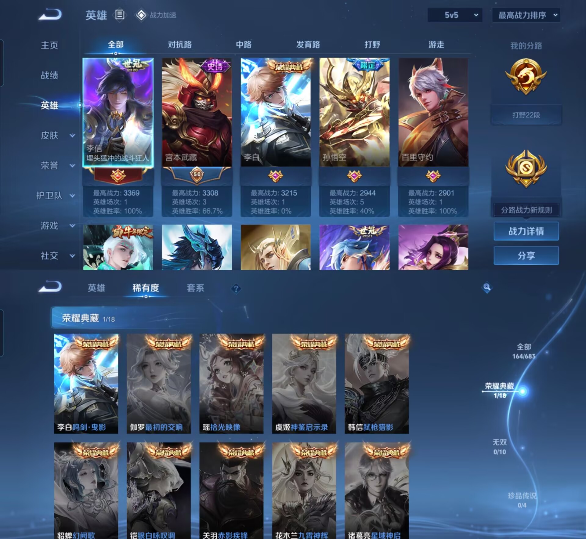 贵族等级:v7皮肤数:164传说品质10 生肖限定3 荣耀典藏1 英雄数:120