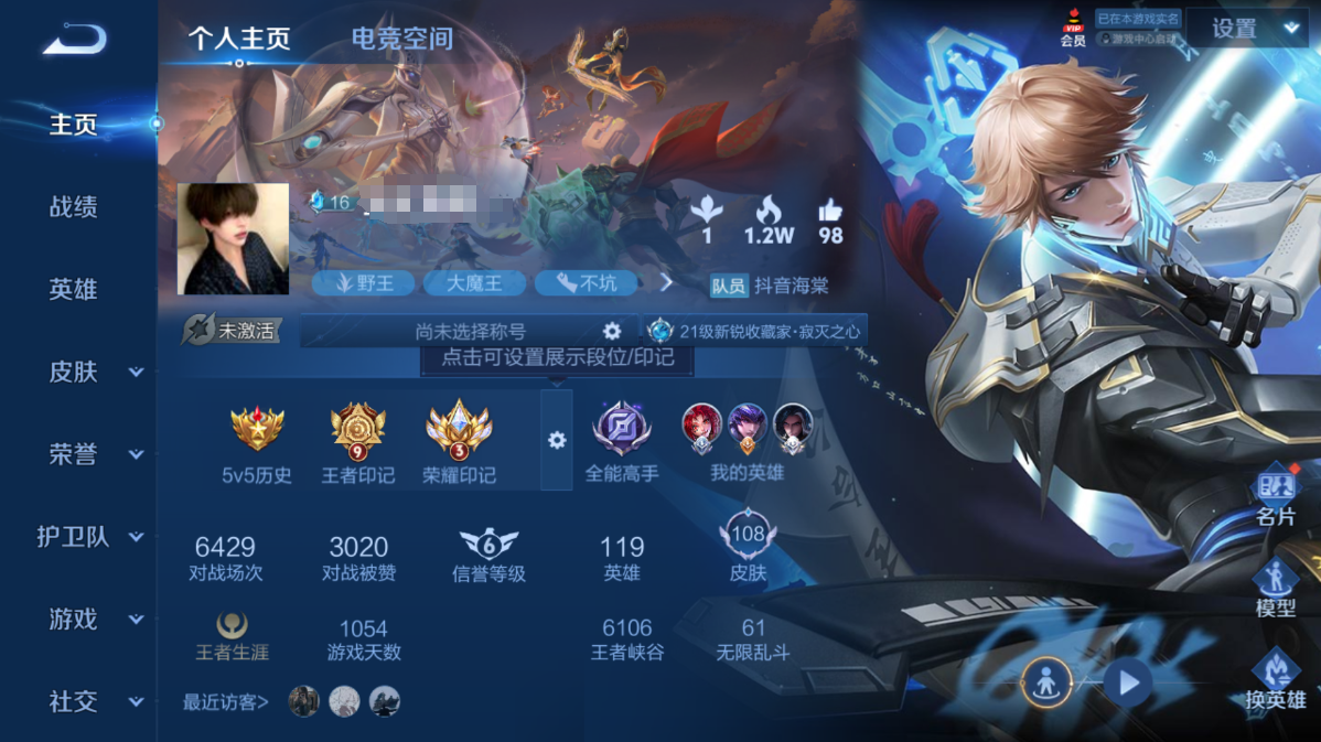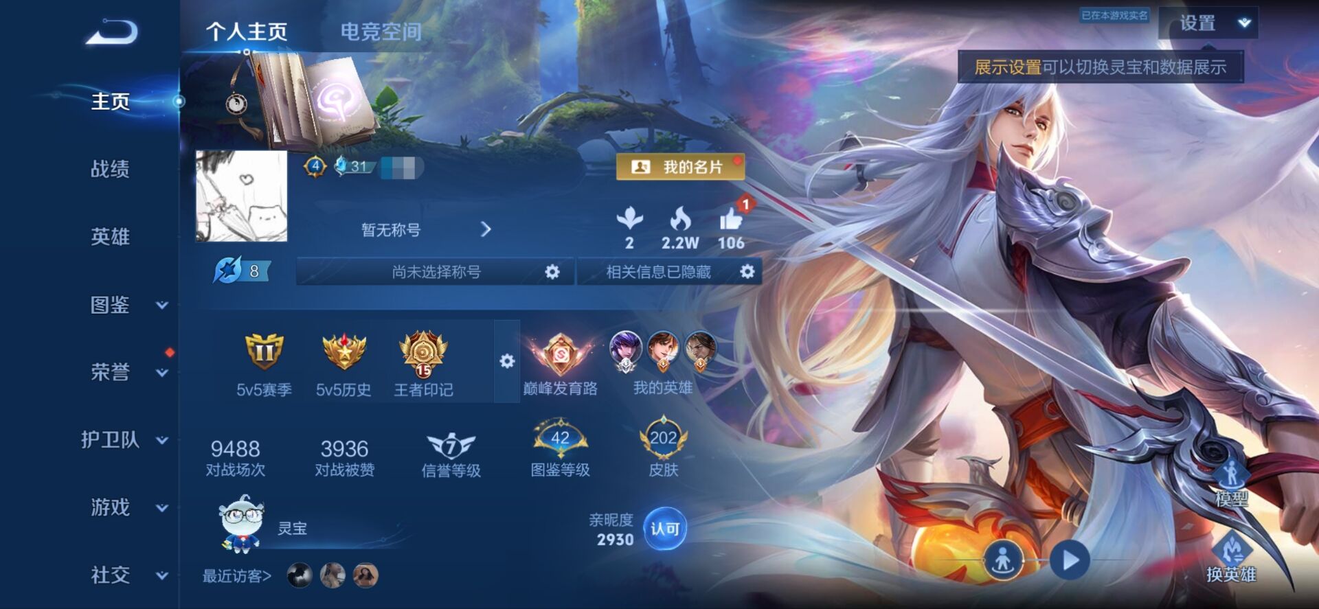 贵族等级:v6皮肤数:108传说品质8 生肖限定2 荣耀典藏1 英雄数:119
