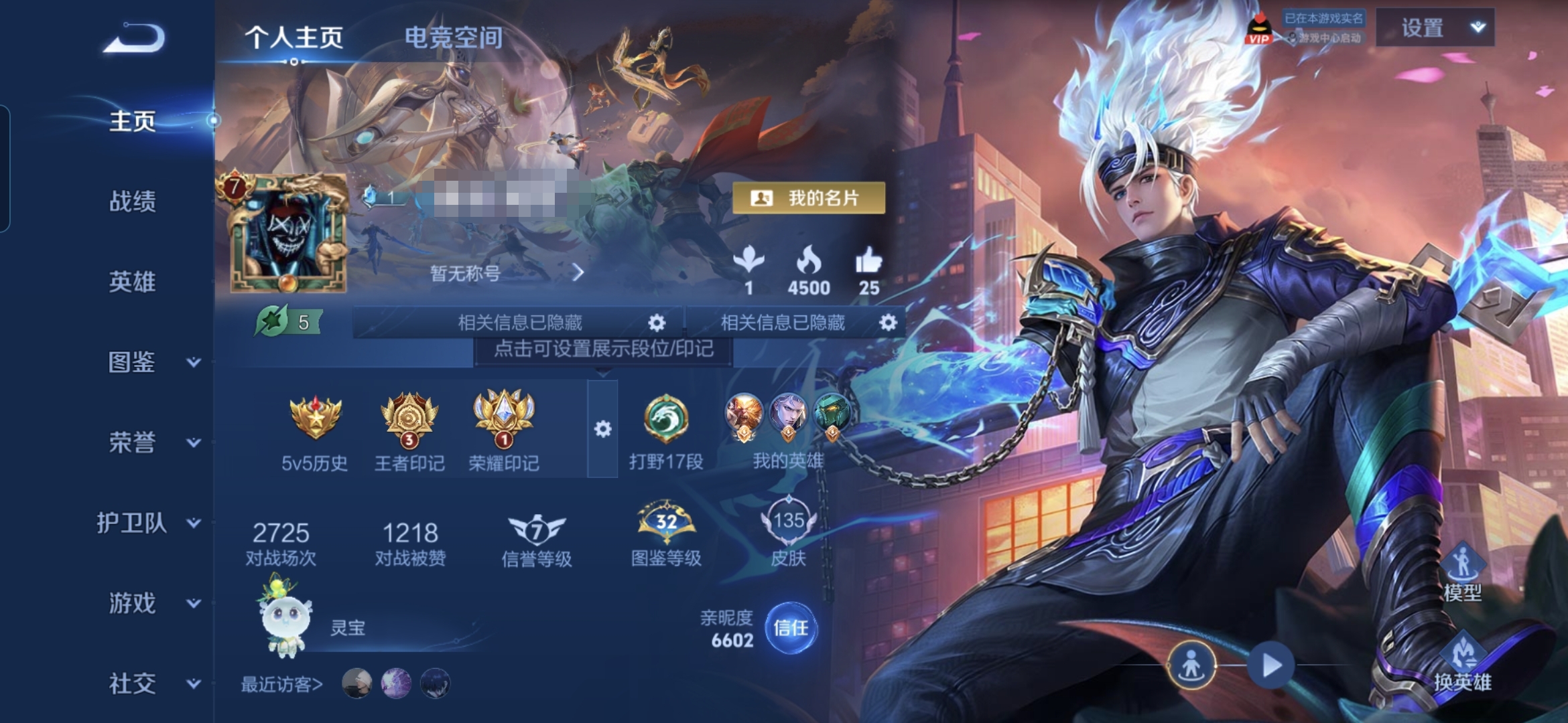 贵族等级:v7皮肤数:135传说品质9 生肖限定1 荣耀典藏1 英雄数:122