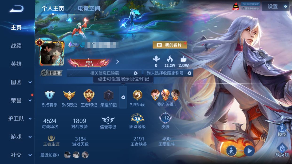 贵族等级:v5皮肤数:238生肖限定3 传说品质3 荣耀典藏1 情人节限定1 英雄数:126