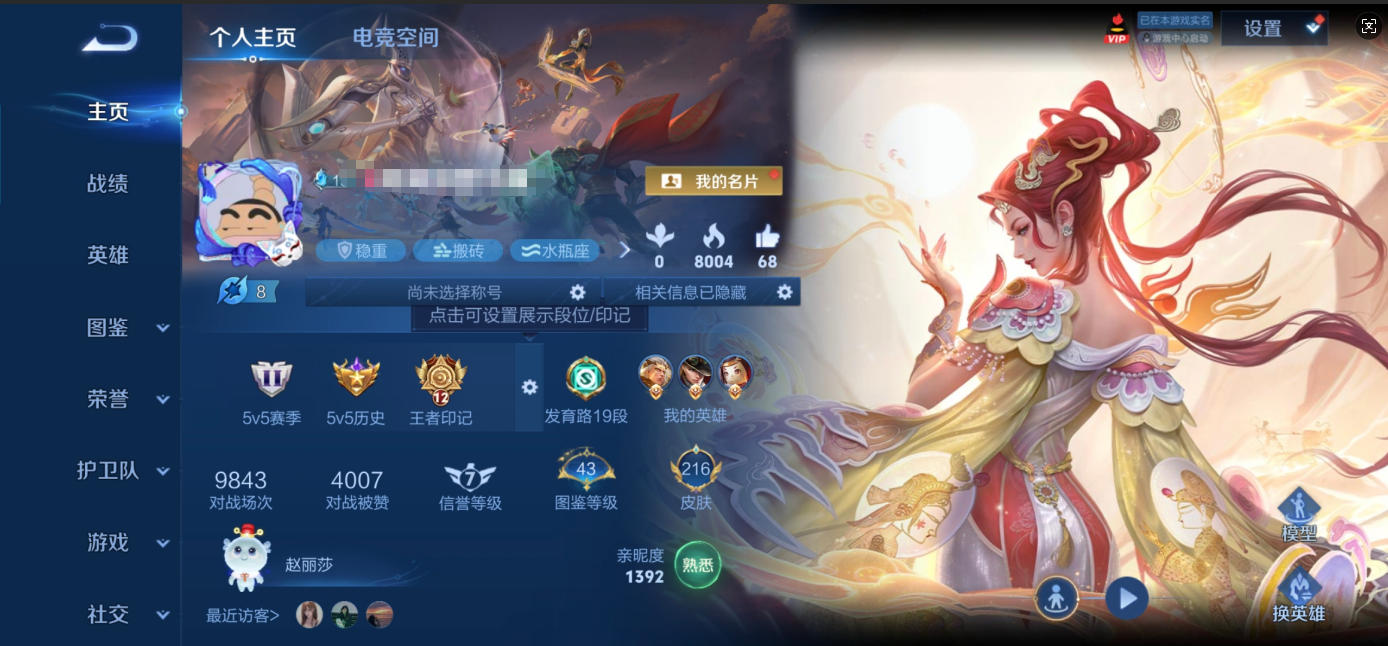 贵族等级:v8皮肤数:216生肖限定3 荣耀典藏1 传说品质9 情人节限定2 英雄数:123