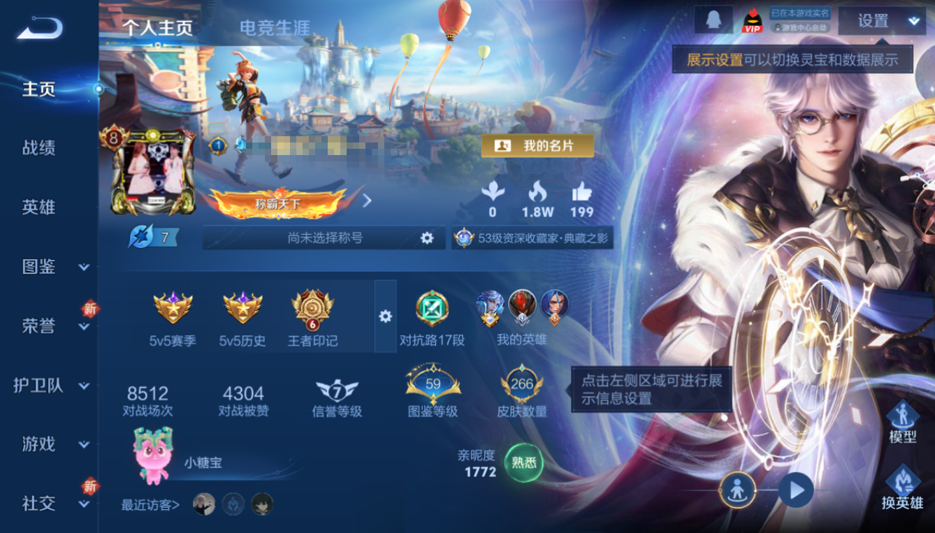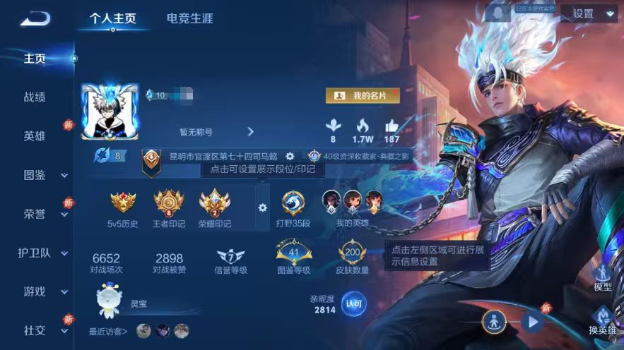 贵族等级:v8皮肤数:266生肖限定7 传说品质13 荣耀典藏1 情人节限定1 英雄数:123