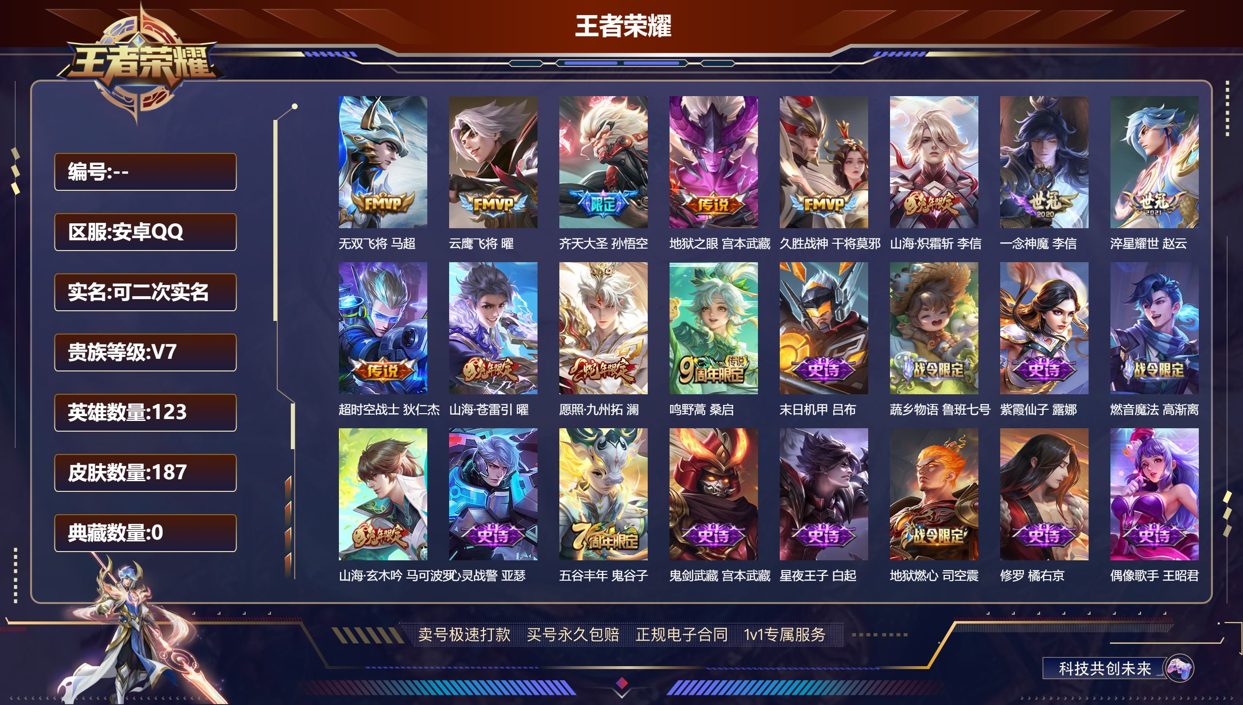 安卓Q-【可二次】-英雄数量:92-皮肤数量:53-贵族等级:贵族V4-特工战影-街头霸王-圣诞恋歌-冰雪圆舞曲-鹰眼护卫-水果甜心-鬼剑武藏-魅力维加斯-乱世虎臣-白执事-忍炎影-掌控之力-海滩派对-乓乓大师-仙境爱丽丝-精灵王-第七人偶-魇语军师-锦衣卫-激情绿茵-战争骑士-花间舞-花见巫女-绝影神枪-威尼斯狂欢-龙域领主-午夜歌剧院-生化警戒-福禄兄弟-超能战警-程咬金群星魔术团-无双福将-死亡骑士-教廷特使-功夫老勺-阴阳师-玩偶对对碰-龙腾万里-花好人间--营地号:1761386492