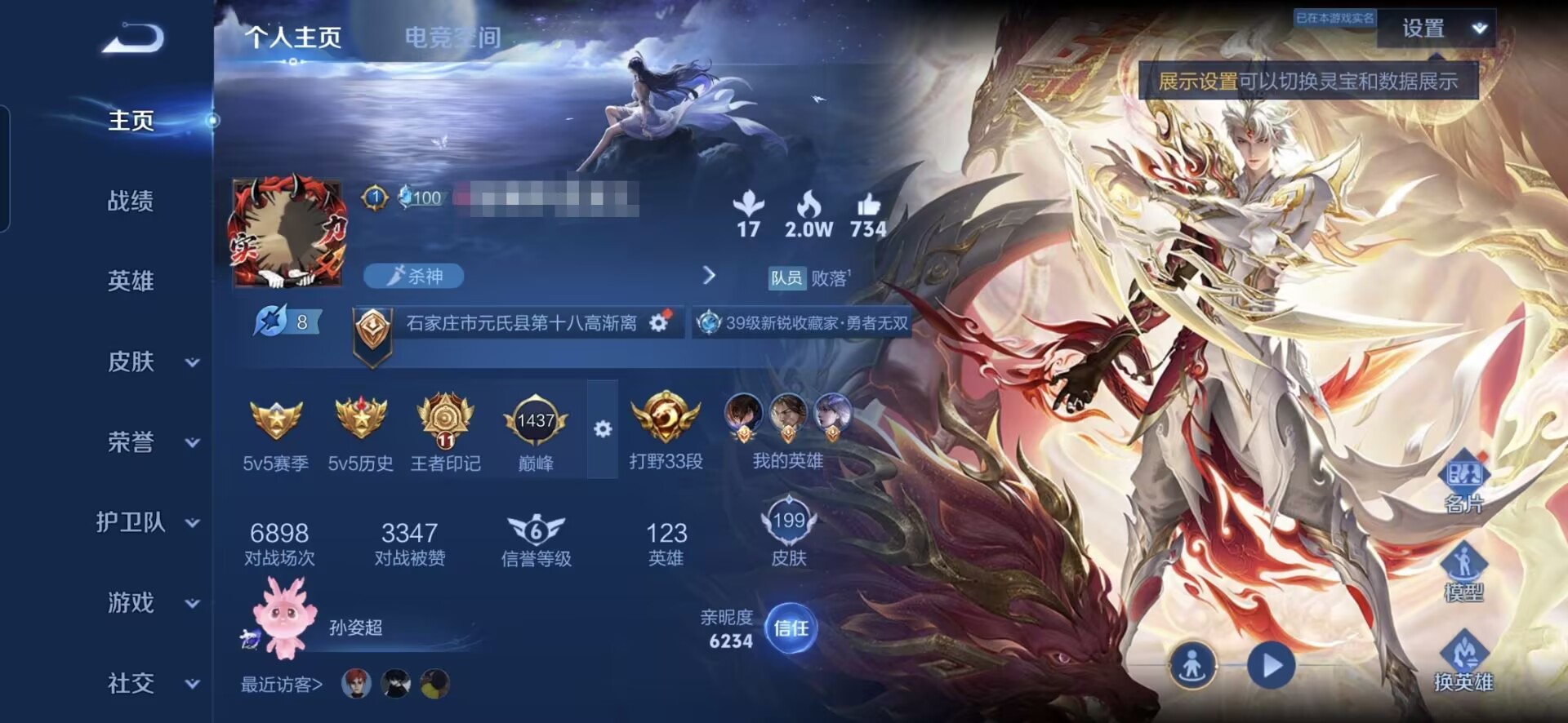 贵族等级:v9皮肤数:361生肖限定7 传说品质23 荣耀典藏3 英雄数:123
