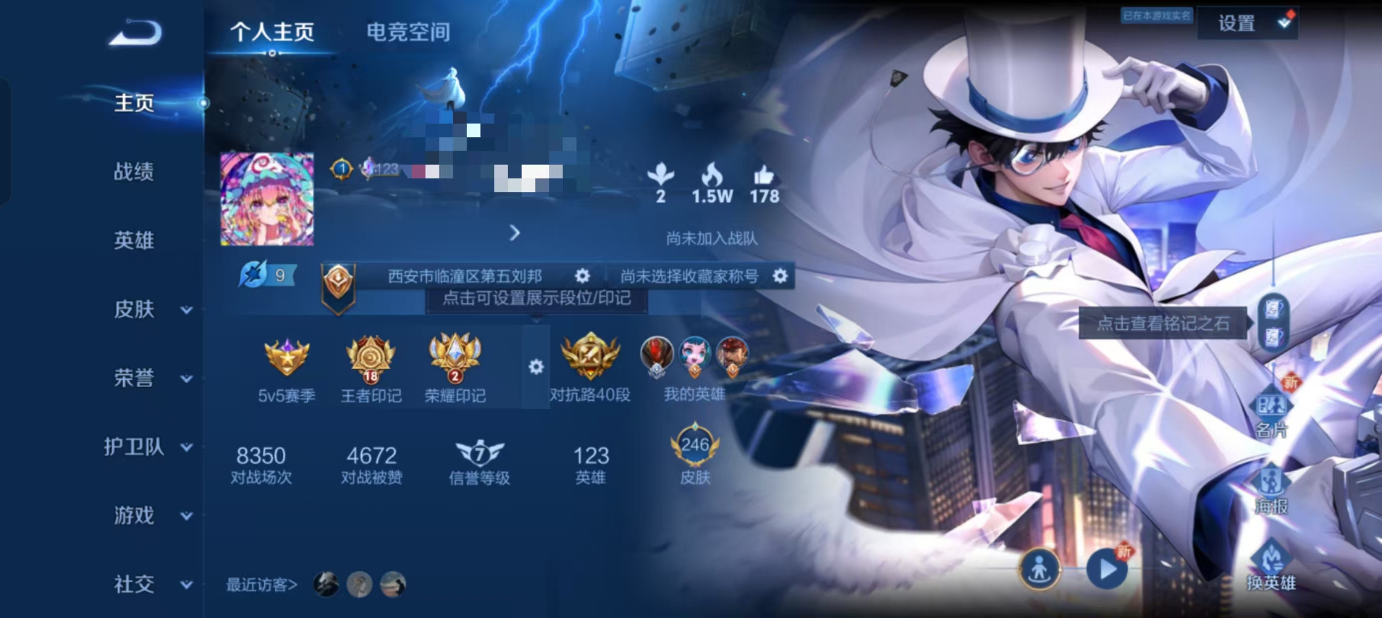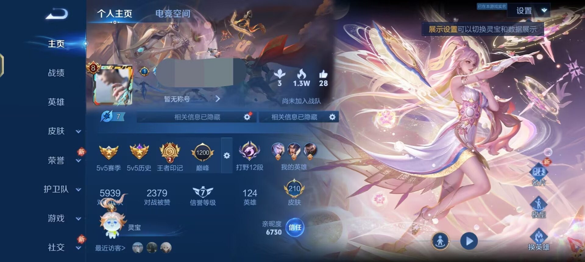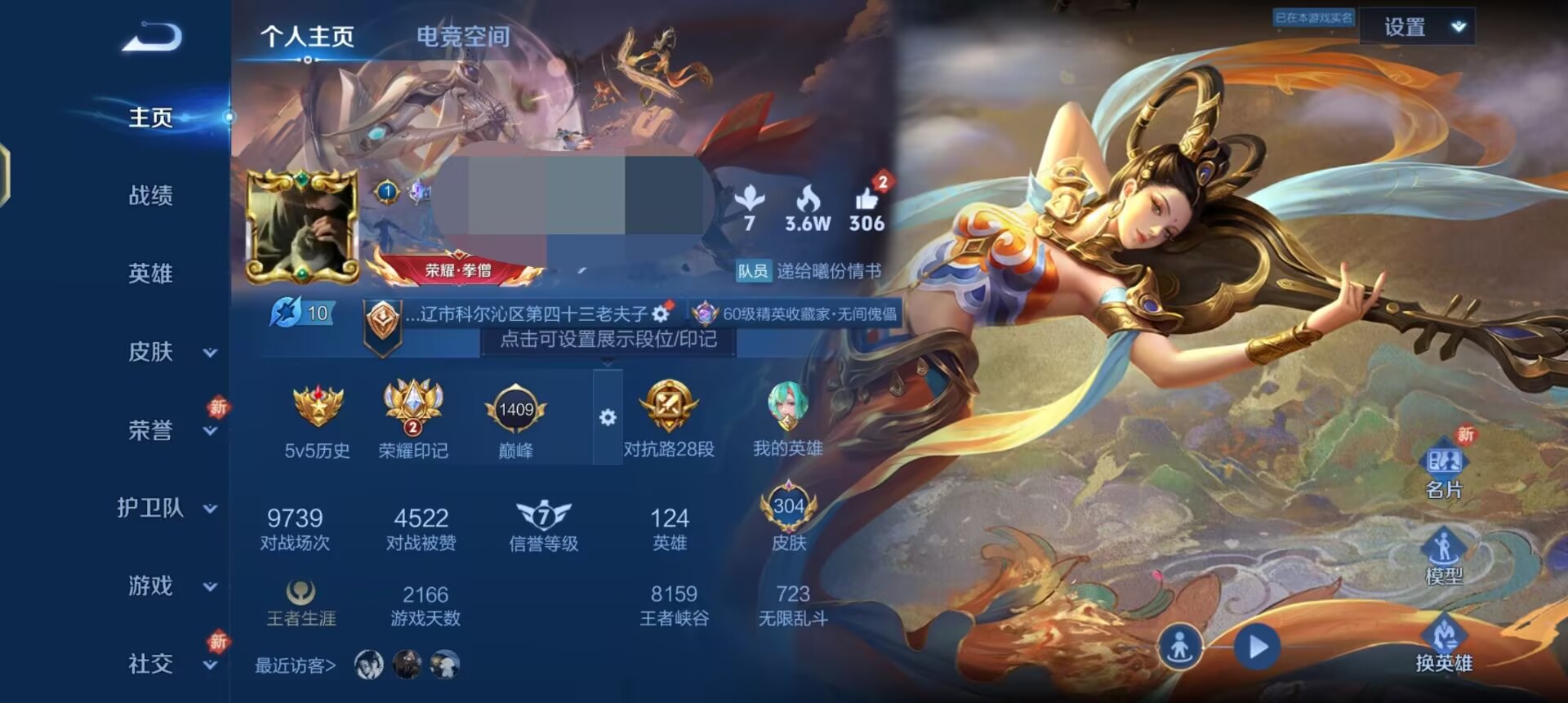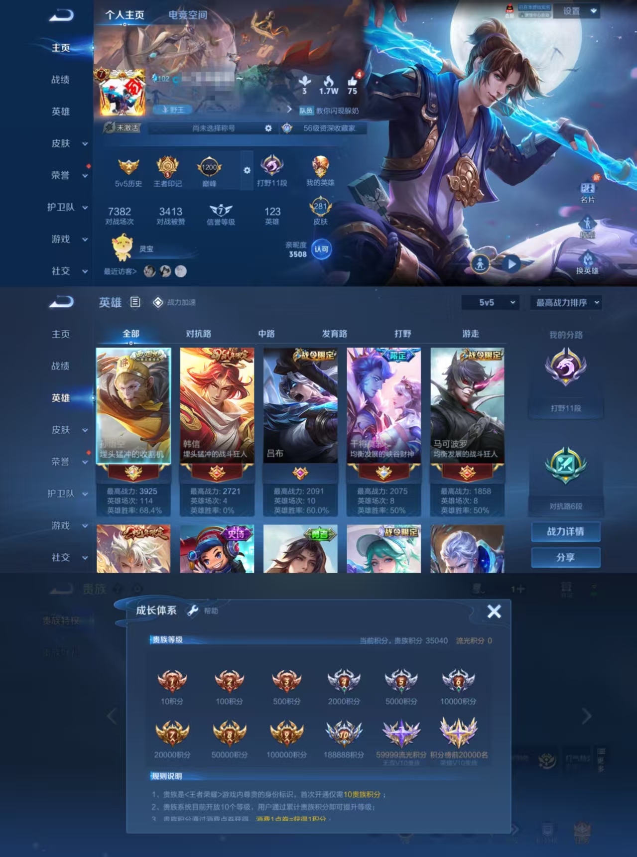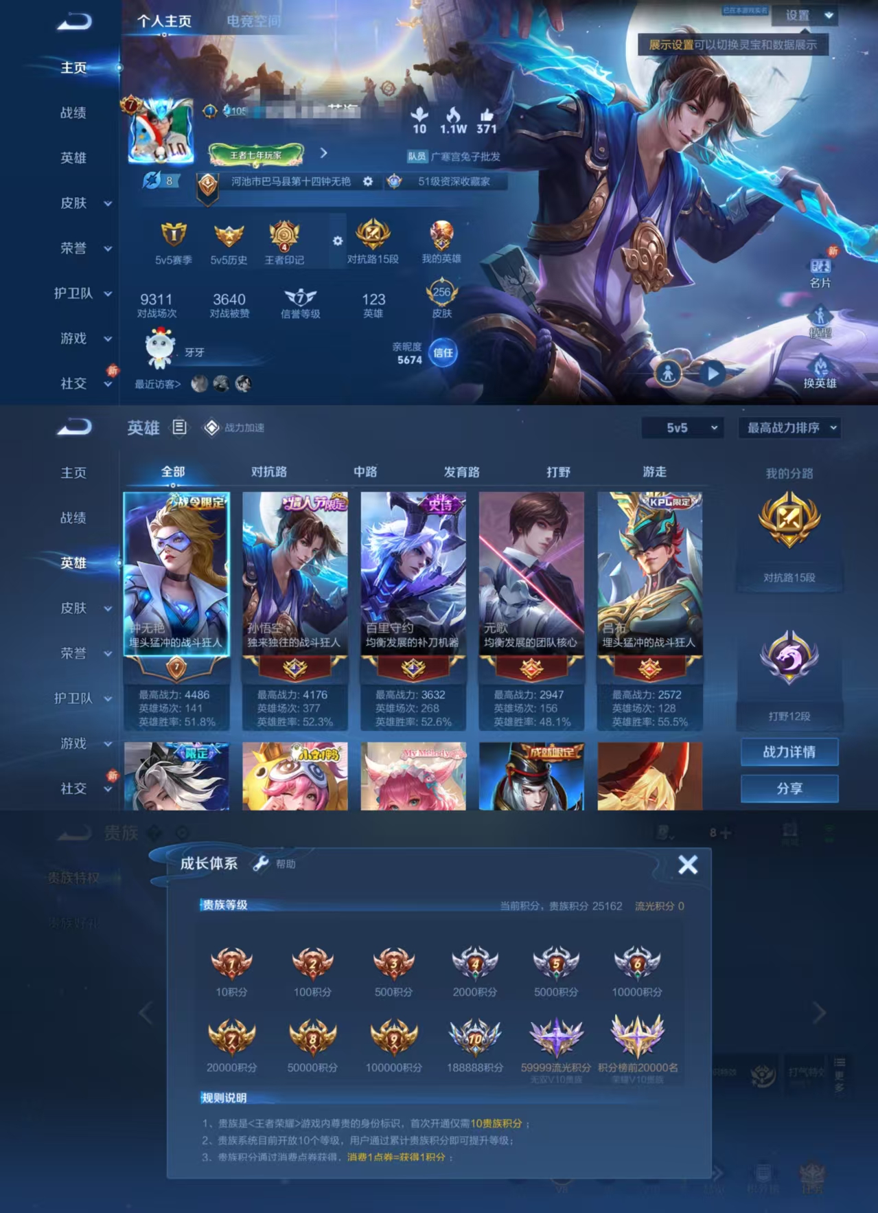 贵族等级:v9皮肤数:152传说品质18 荣耀典藏3 英雄数:121