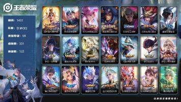 贵族等级:v1皮肤数:20勇者品质8 活动专属3 青春校园1 西部大镖客1 传说品质1 史诗品质5 冰雪之歌1 限定5 周年限定1 新春专属1 源梦皮肤1 赛季限定3 英雄数:54