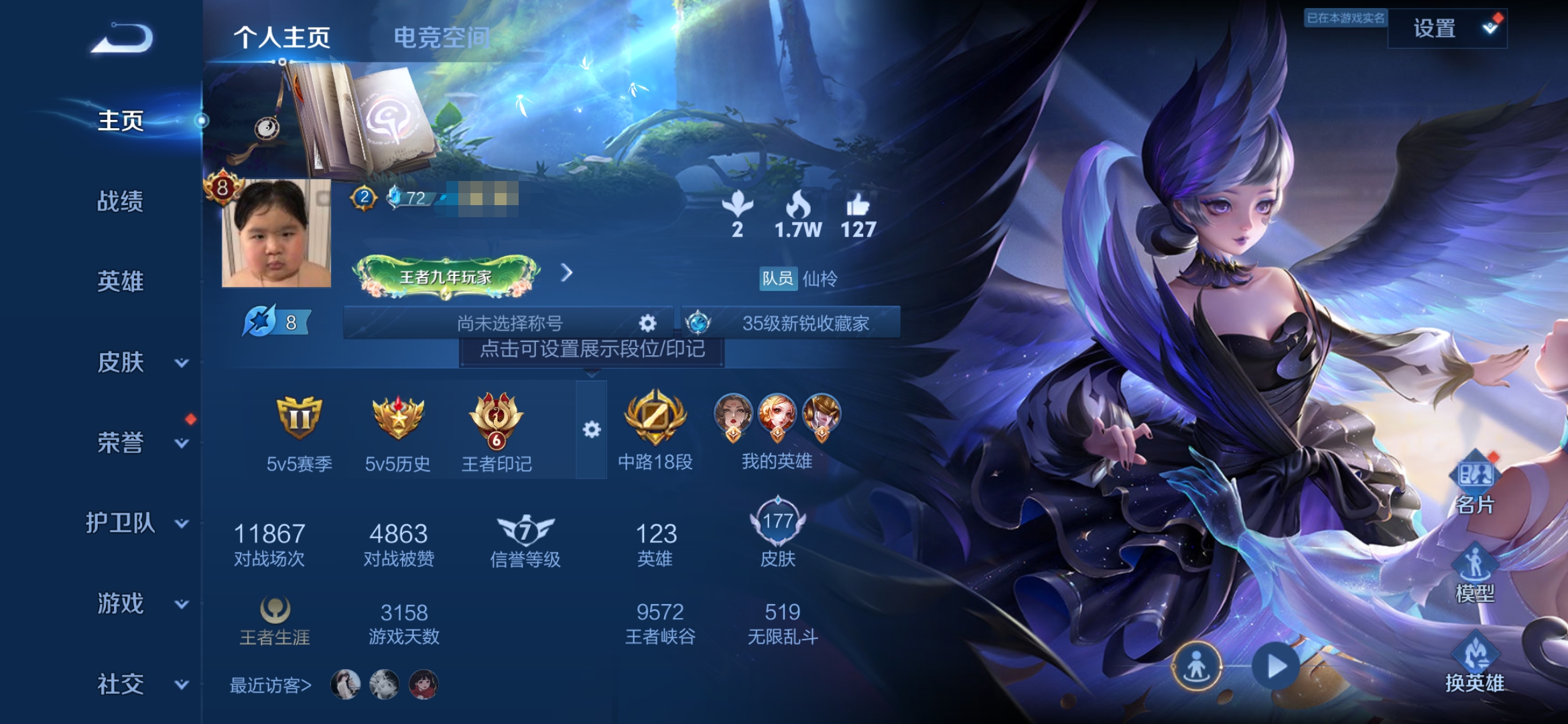 贵族等级:v6皮肤数:123勇者品质62 赛季限定15 限定38 史诗品质24 周年限定3 中华曲艺1 活动专属6 青春校园2 新春专属2 源梦皮肤3 战令限定10 神迹守卫1 传说品质2 天文志(牛年限定)1 生肖限定1 五路精神3 奇趣潮玩3 夏日海滩2 神州地方志1 冰雪之歌1 胡桃异想国1 魔法世界1 西部大镖客2 五五朋友节1 圆桌骑士2 CP皮肤1 圣诞颂歌1 世冠皮肤1 珍宝阁专属1 归虚梦演1 乐园午夜1 贵族限定3 成就限定1 信誉专属1 五环荣耀1 英雄数:103