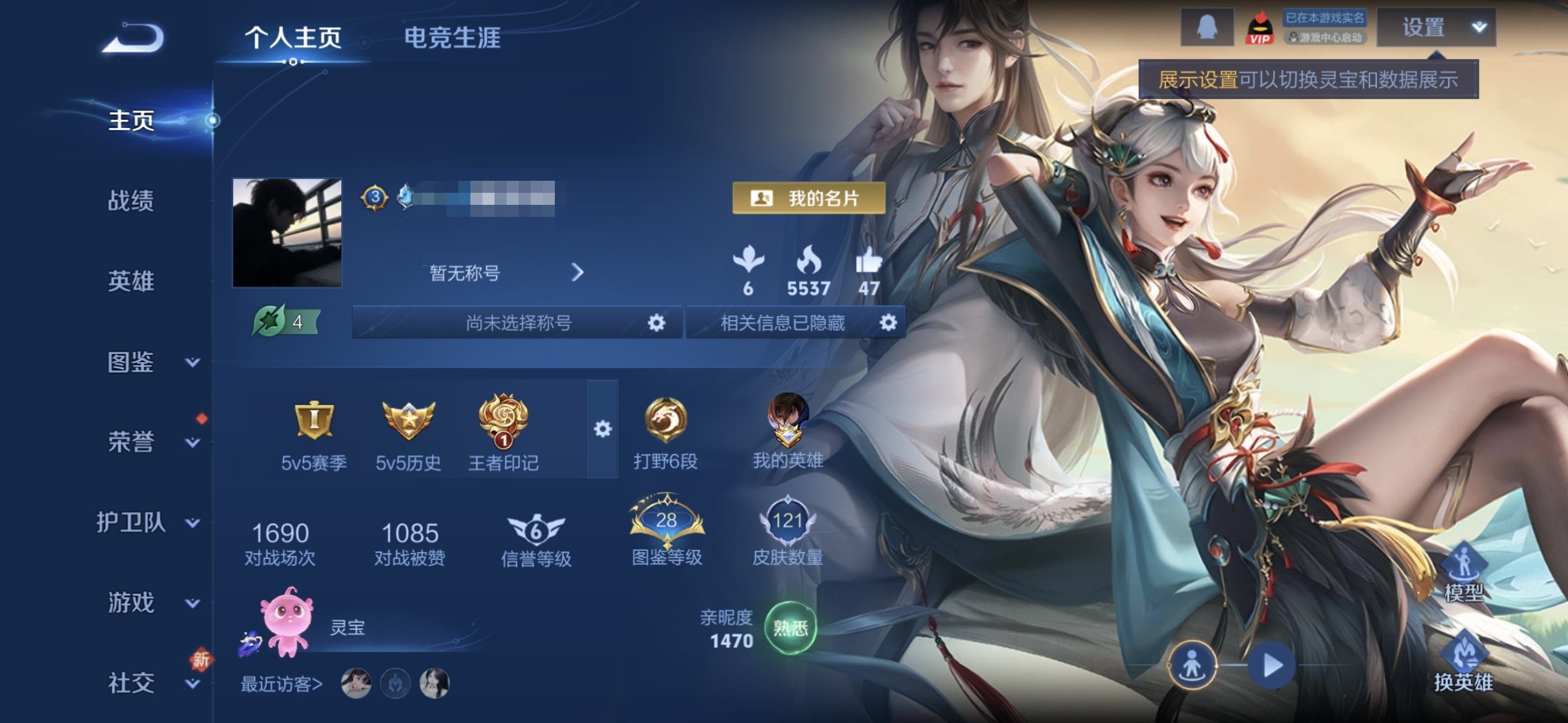 贵族等级:v9皮肤数:392传说品质26 生肖限定6 情人节限定4 荣耀典藏3 无双1 英雄数:128