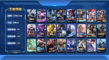 贵族等级:v8皮肤数:232情人节限定3 传说品质21 生肖限定8 珍品传说1 荣耀典藏1 英雄数:127