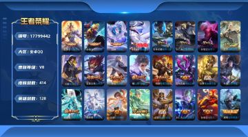 贵族等级:v8皮肤数:414生肖限定11 传说品质17 情人节限定3 荣耀典藏3 珍品传说1 英雄数:128
