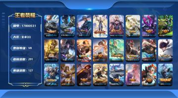 贵族等级:v7皮肤数:291传说品质8 生肖限定3 情人节限定3 珍品传说1 荣耀典藏1 英雄数:127