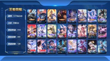 贵族等级:v10皮肤数:643生肖限定34 传说品质110 情人节限定16 荣耀典藏7 无双8 珍品传说3 英雄数:128