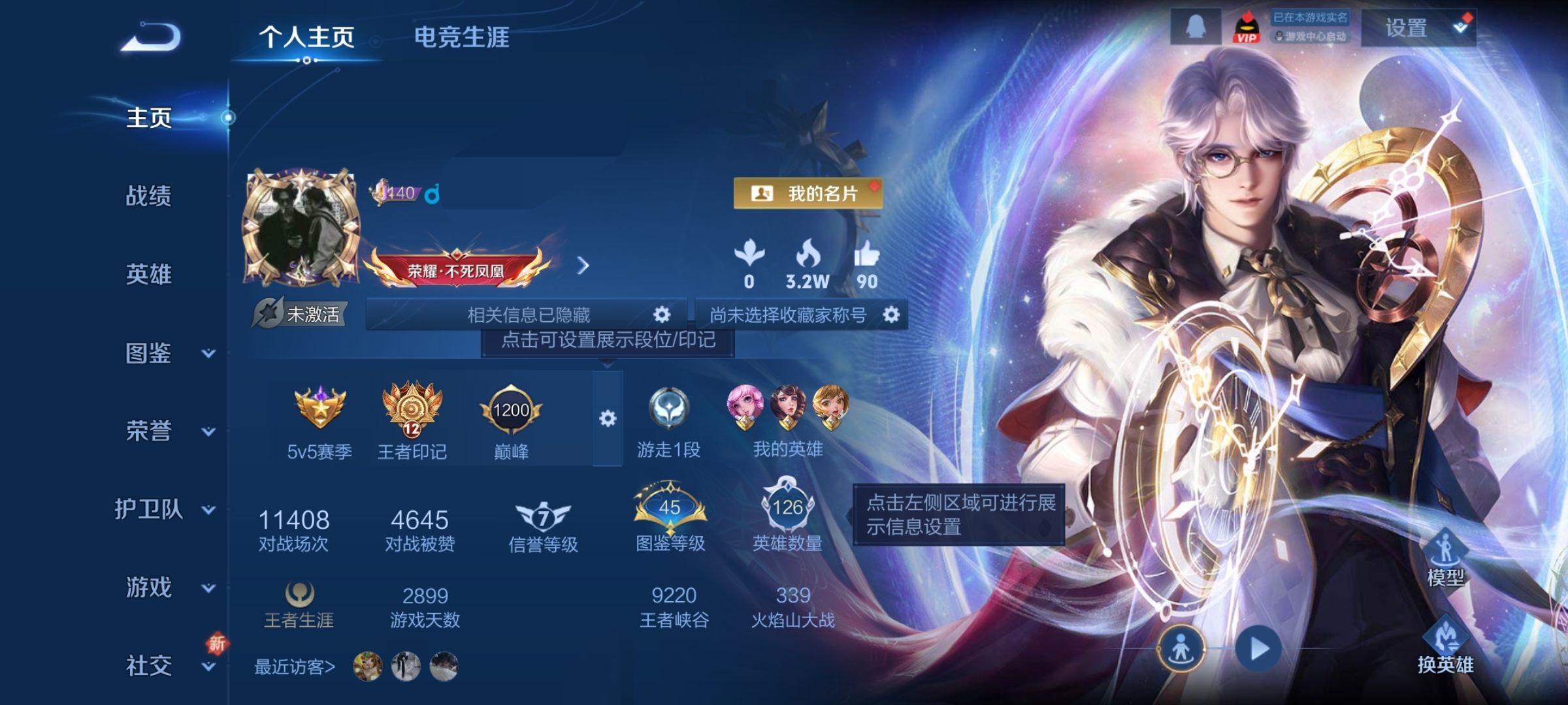 贵族等级:v7皮肤数:304传说品质13 生肖限定3 情人节限定2 荣耀典藏1 英雄数:126