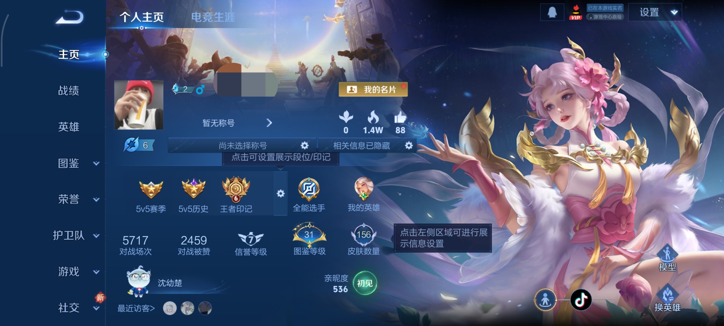 贵族等级:v7皮肤数:156传说品质5 生肖限定2 英雄数:125