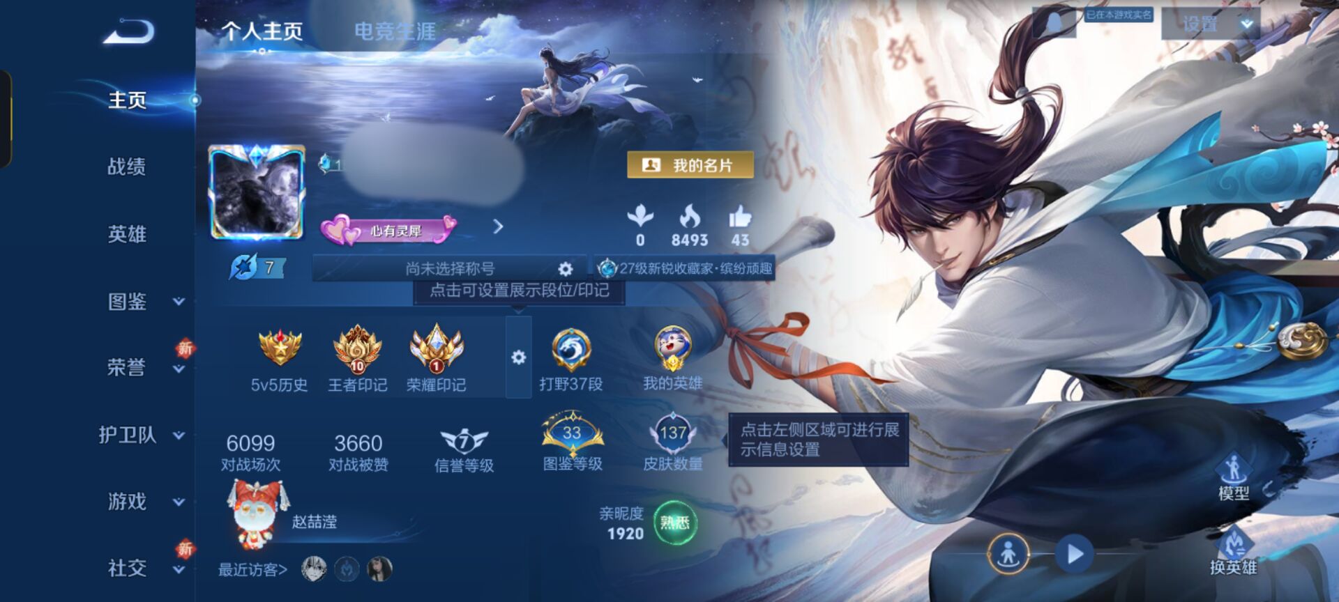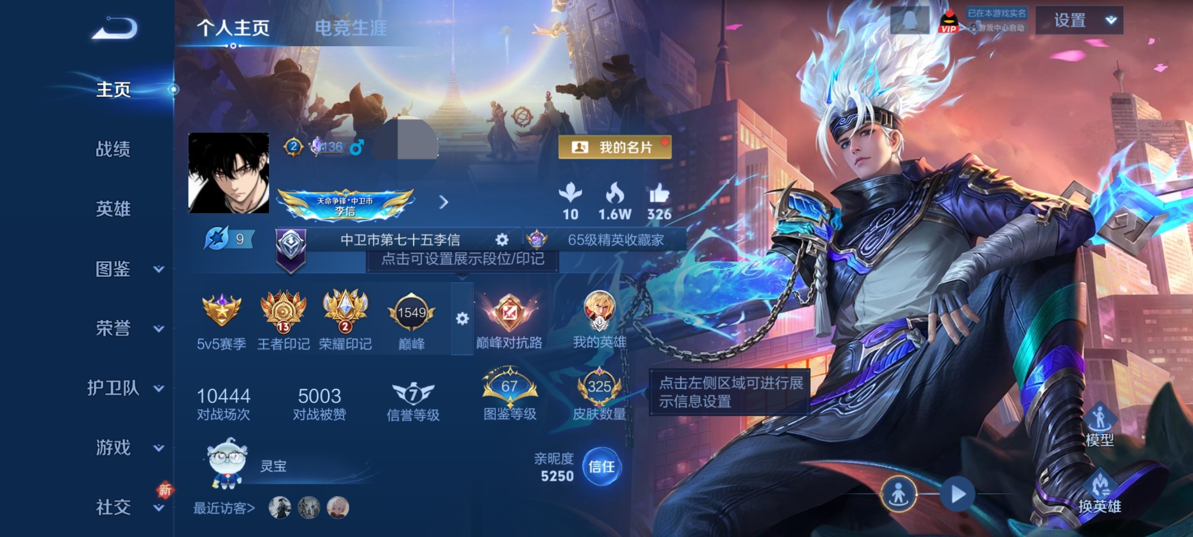 贵族等级:v7皮肤数:253传说品质14 生肖限定4 情人节限定1 荣耀典藏1 无双1 英雄数:127