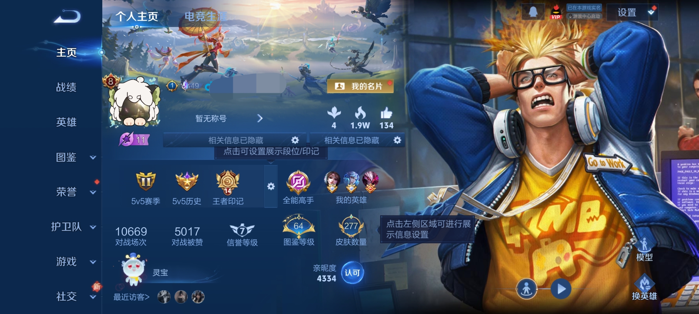 贵族等级:v8皮肤数:277传说品质8 生肖限定5 情人节限定2 荣耀典藏2 英雄数:128