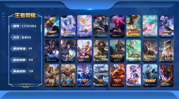 贵族等级:v9皮肤数:343传说品质19 情人节限定5 荣耀典藏2 生肖限定2 英雄数:128