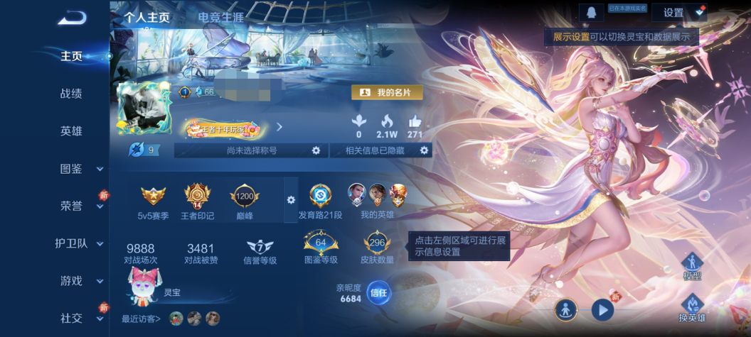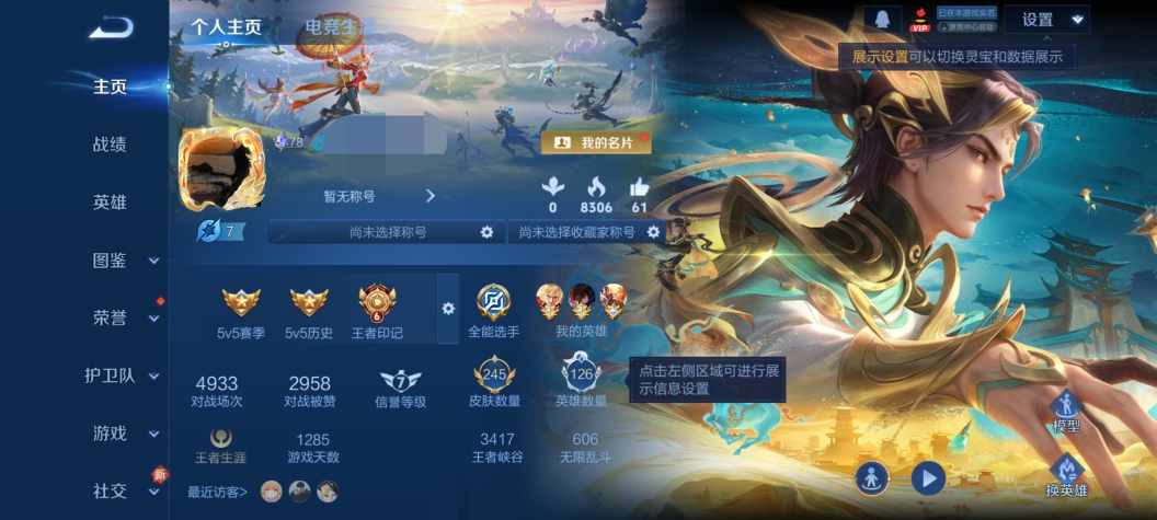 贵族等级:v8皮肤数:296生肖限定5 传说品质10 荣耀典藏2 情人节限定2 英雄数:126