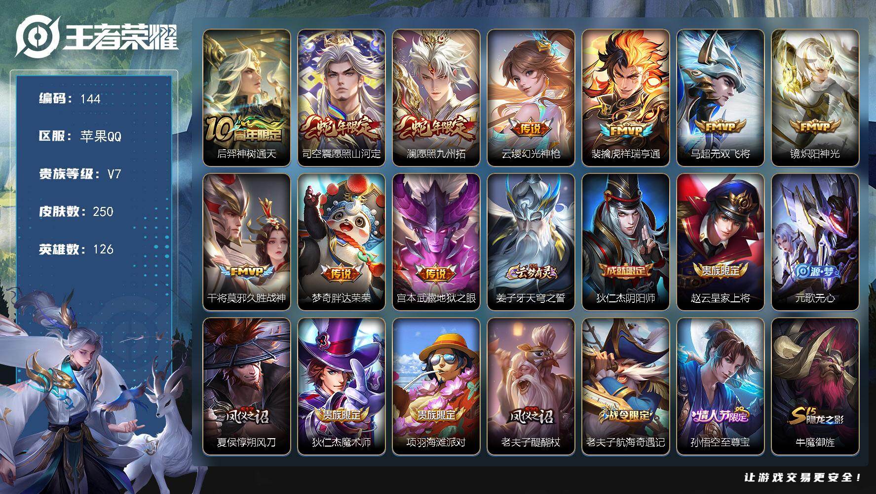 贵族等级:v7皮肤数:172传说品质7 生肖限定2 珍品传说1 英雄数:126