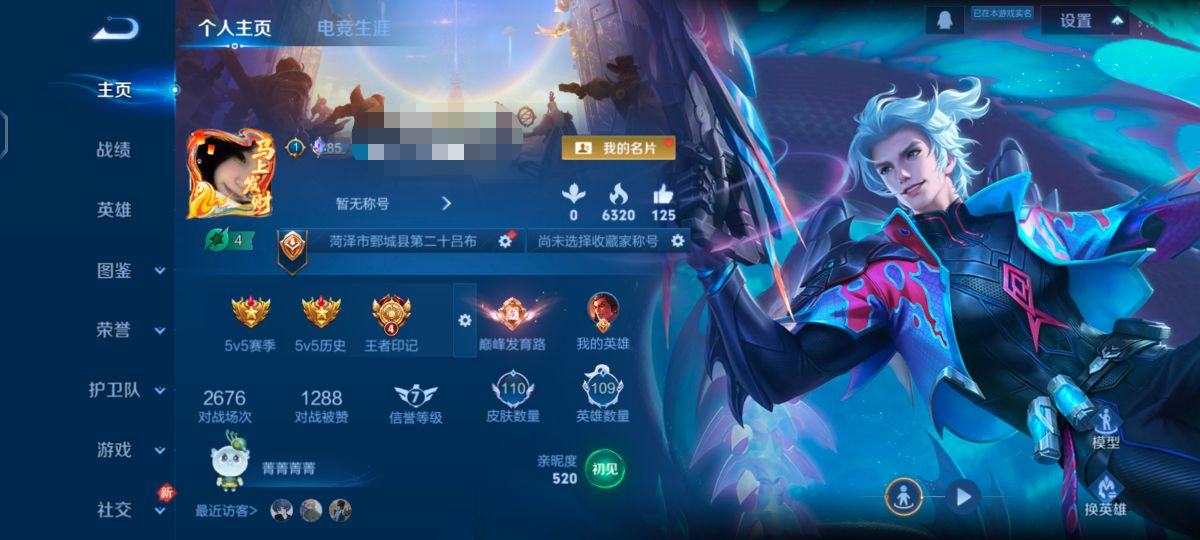 贵族等级:v7皮肤数:110传说品质13 情人节限定1 生肖限定1 英雄数:109